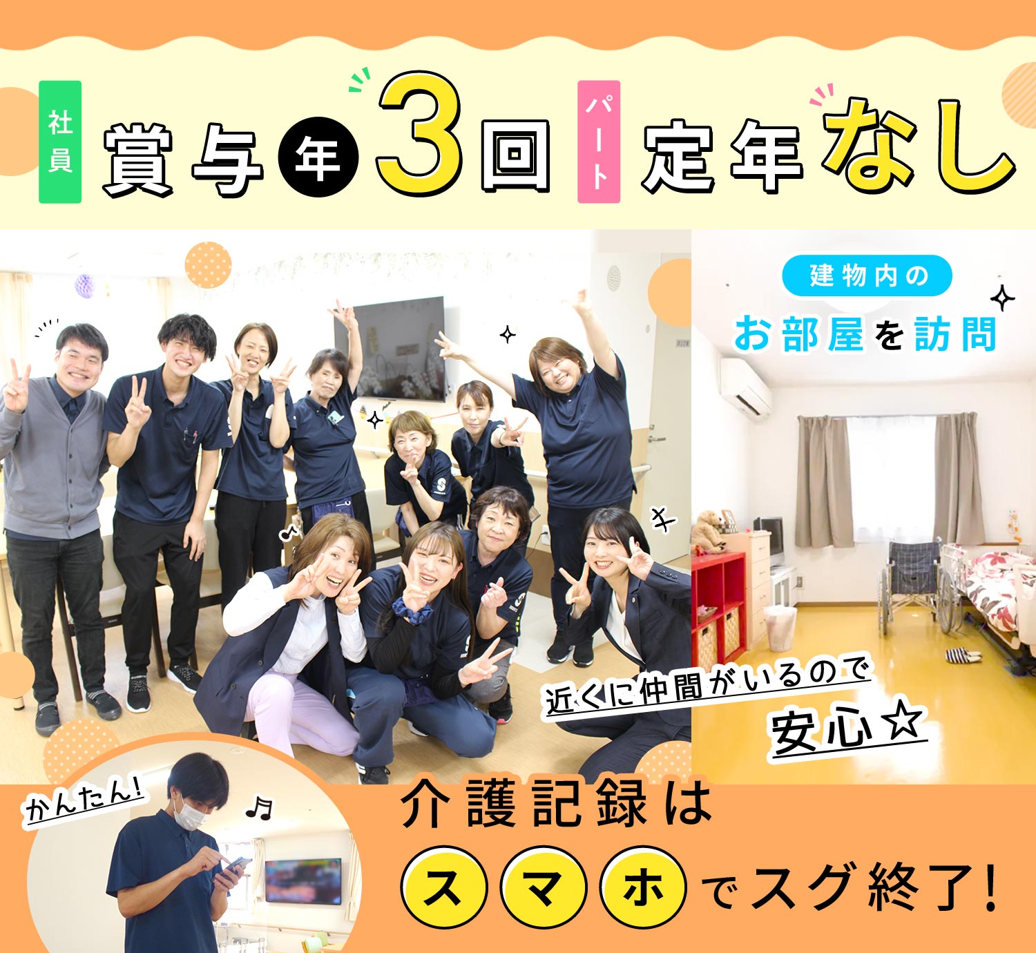| 応募方法 | □ お気軽に【応募する】ボタンよりご応募ください □ 24時間受付中です <まずは見学も歓迎!※希望者のみ> 施設の雰囲気や一緒に働く仲間を見てからの応募でも大丈夫です。 □□□ 電話での応募も受付中! 「ジ ョ ブ ポ ス タ ー を見て応募したのですが」と、 お電話すると、スムーズです! |