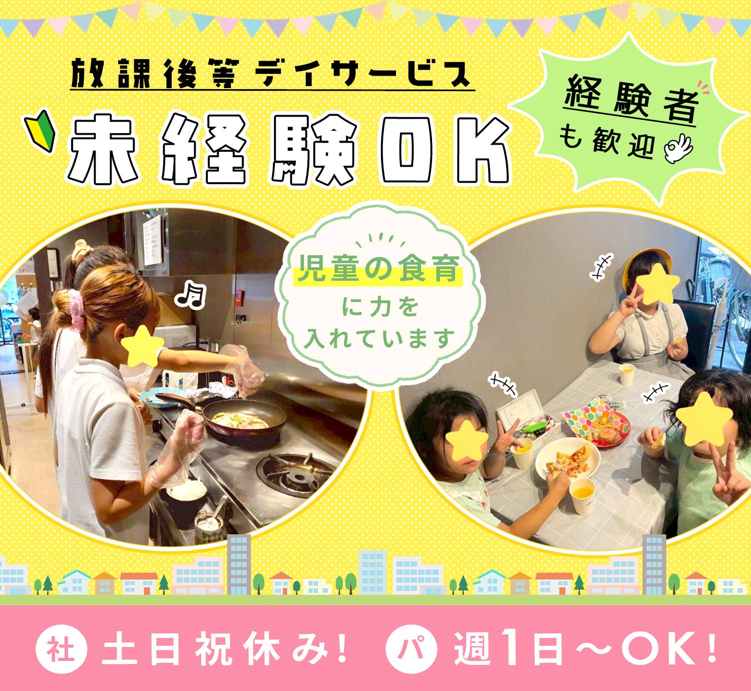 | 応募資格 | 下記(a)(b)(c)いずれかに該当する方 (a)無資格・未経験OK 教育・心理・社会福祉・社会いずれかの学部・学科などの卒業者、歓迎 (b)教員免許(幼稚園・小・中・高いずれか)、保育士、社会福祉士、精神保健福祉士、臨床心理士、公認心理師、臨床発達心理士等の資格をお持ちの方 (c)経験者 高等学校を卒業し児童福祉事業(学童保育、乳児院、地域子育て支援事業所、保育所、こども園など)の実務経験が2年以上ある方 #ブランクOK ※療育未経験OK ※保育園や学校などの現場未経験OK ※経験者も歓迎 ※普通自動車免許(AT限定可)をお持ちの方、優遇/運転できる方、優遇 |