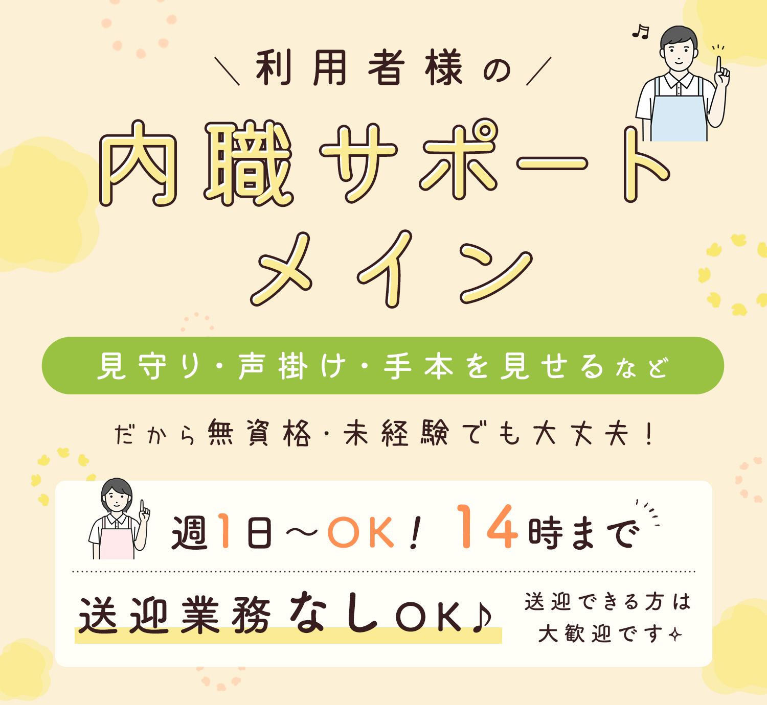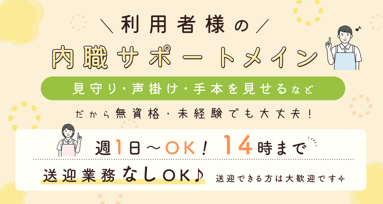 | 仕事内容 | 無資格OKの職業指導員・生活支援員・介護/シニアも歓迎[パ] 障がいのある方などが通い、軽作業などの就労訓練を行う施設での勤務。 利用者様の内職の見守りや声掛け、お手本を見せたりアドバイス等のサポート業務をお願いします。 ※調理業務なし ※送迎できる方は大歓迎ですが、免許がない、運転が苦手、と言う方もOKです! |
