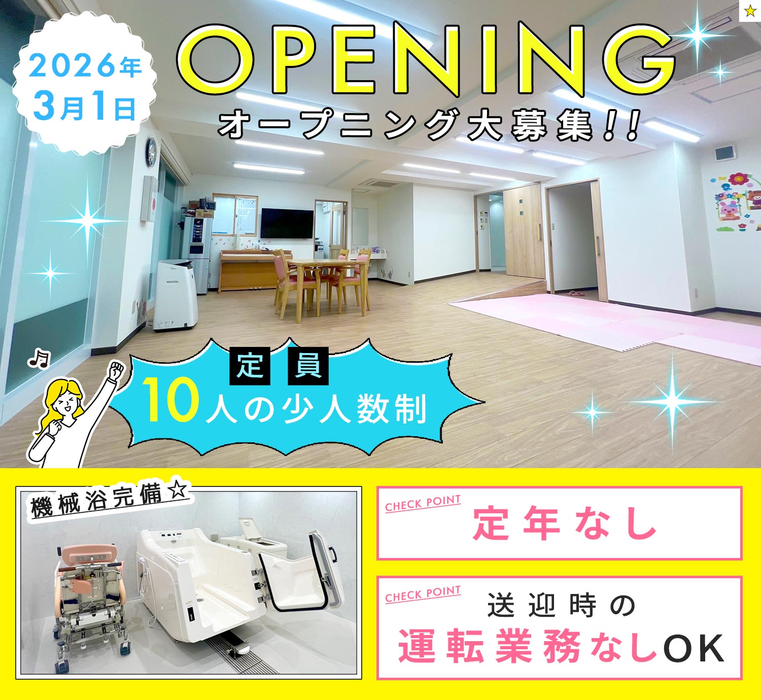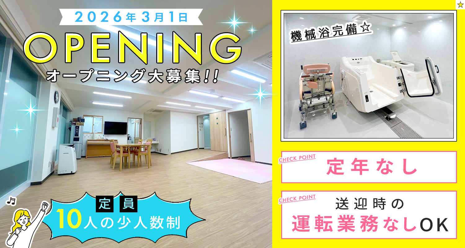 | 仕事内容 | 夜勤なしの介護職/オープニング[社] 障がいをお持ちの方が日中の生活を過ごされる施設での勤務。 利用者様の身の回りの介助や日中活動の支援をお願いします。 ※利用者数:1日の定員10名 ※送迎の運転業務できる方は尚可(免許が無い方など、送迎業務なしでの勤務もOK) #オープニングスタッフ |