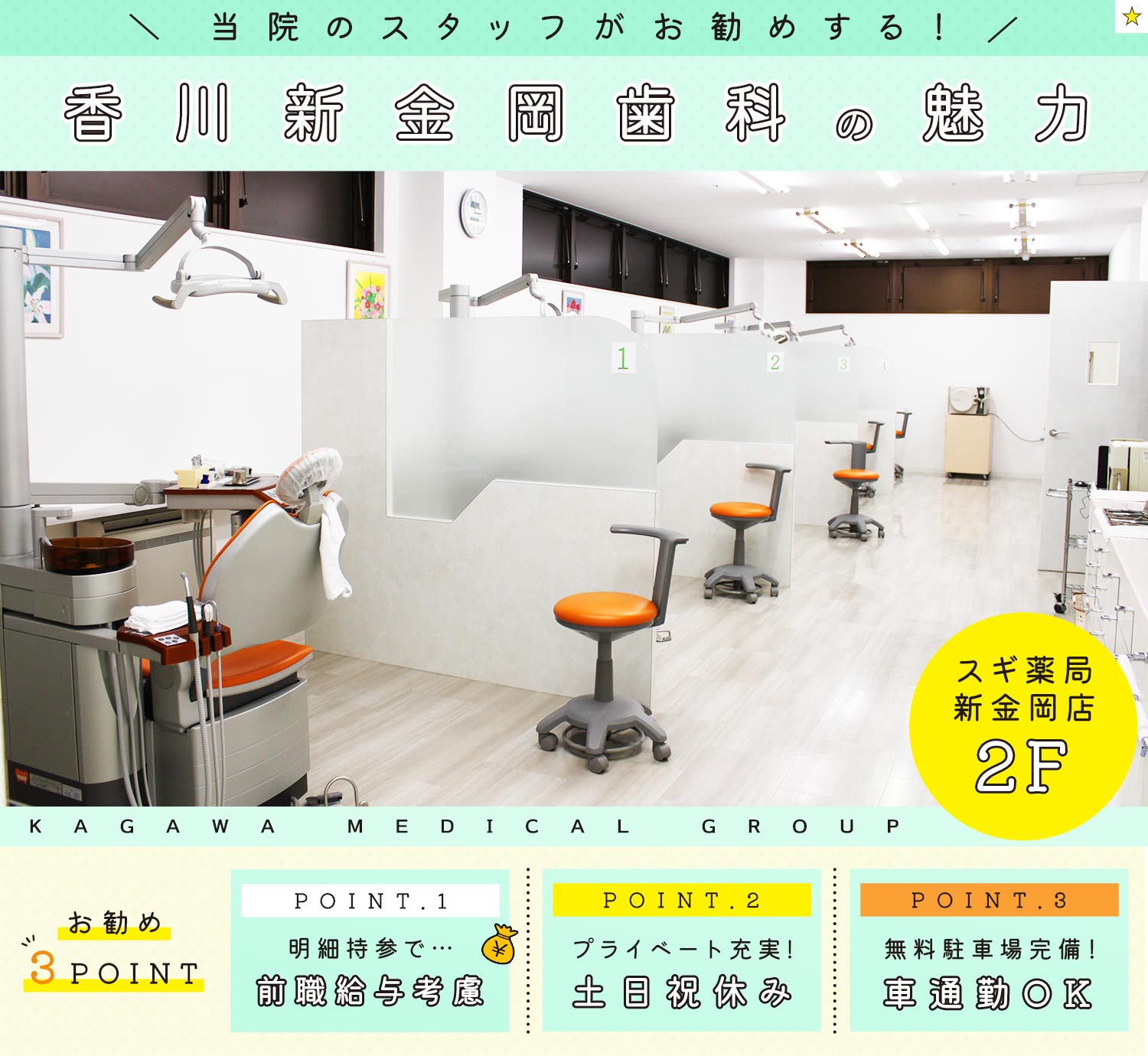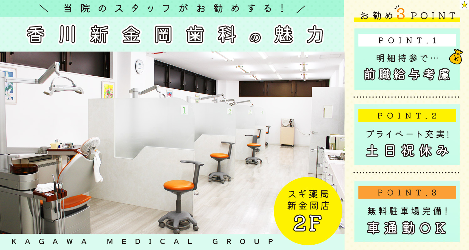 | 仕事内容 | 歯科助手・受付・事務/土日祝休み[社] 患者様の受付・会計・予約管理のほか、 治療のアシスタント(器具の準備・片付け等)をお願いします。 ※直接患者様に触れる医療行為はありませんのでご安心ください◎ □□□ <充実の研修で、成長をサポート> “お口の健康をお守りし、充実した人生のお手伝いがしたい” 香川メディカルグループでは質の高いケアで患者様に満足いただけるよう、自社の研修施設を設立し、スタッフの技術向上に努めています。 これまで数多くのスタッフを育ててきた実績・ノウハウがありますので、未経験の方、ブランクがある方も安心してスタートできますよ! |