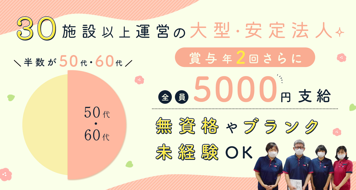 | 給 与 | 時給1120円~1365円以上 ※経験・資格考慮 ※毎年昇給あり <別途、手当あり> 賞与年2回:1万円~6万円(2024年度実績) 送迎手当:時給50円UP(送迎はできる方のみでOK) 年末年始手当 試用期間2ヵ月(同条件) |