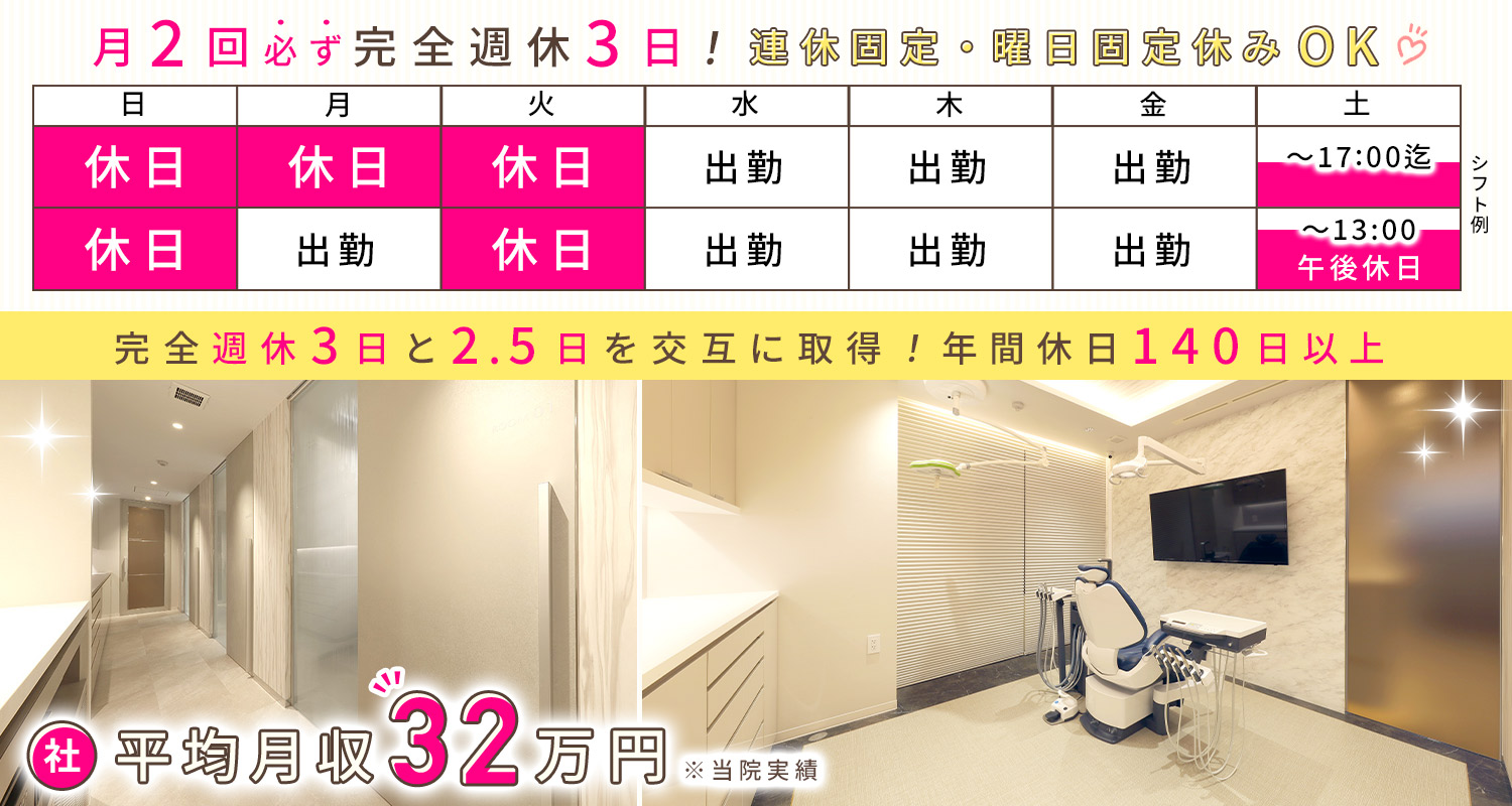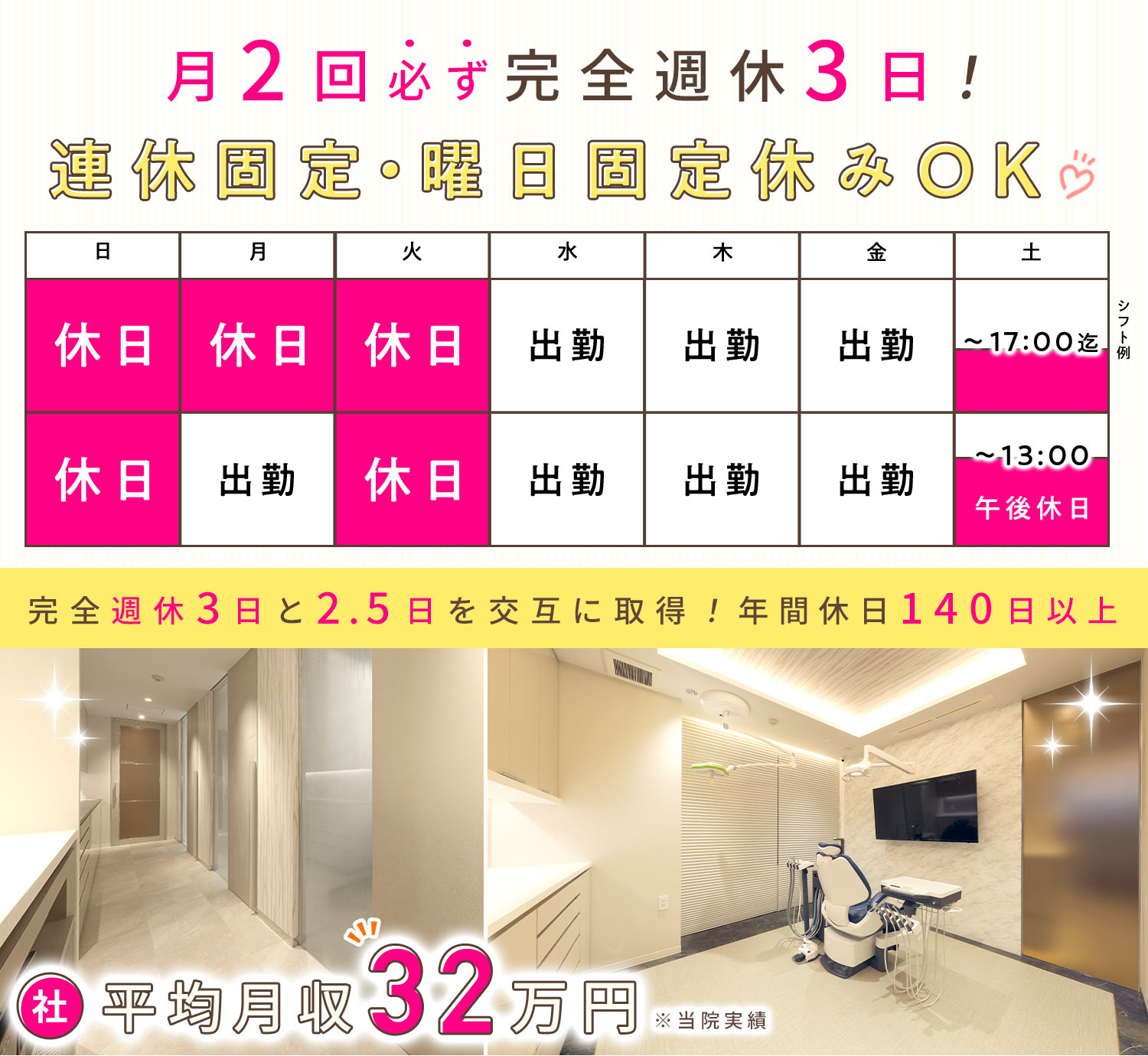 | 休日・休暇 | 完全週休3日と完全週休2.5日を交互に取得(月2回、週休3日) ※年間休日140日以上 ※毎週、火曜・日曜+他半日~1日+祝日休み(振替出勤なし) ※連休固定・曜日固定休みOK ※月1~2回、土日連休OK <休診>火曜・祝日(祝日の振替出勤なし) <休暇>有給、GW、夏季、年末年始(各約7日) |