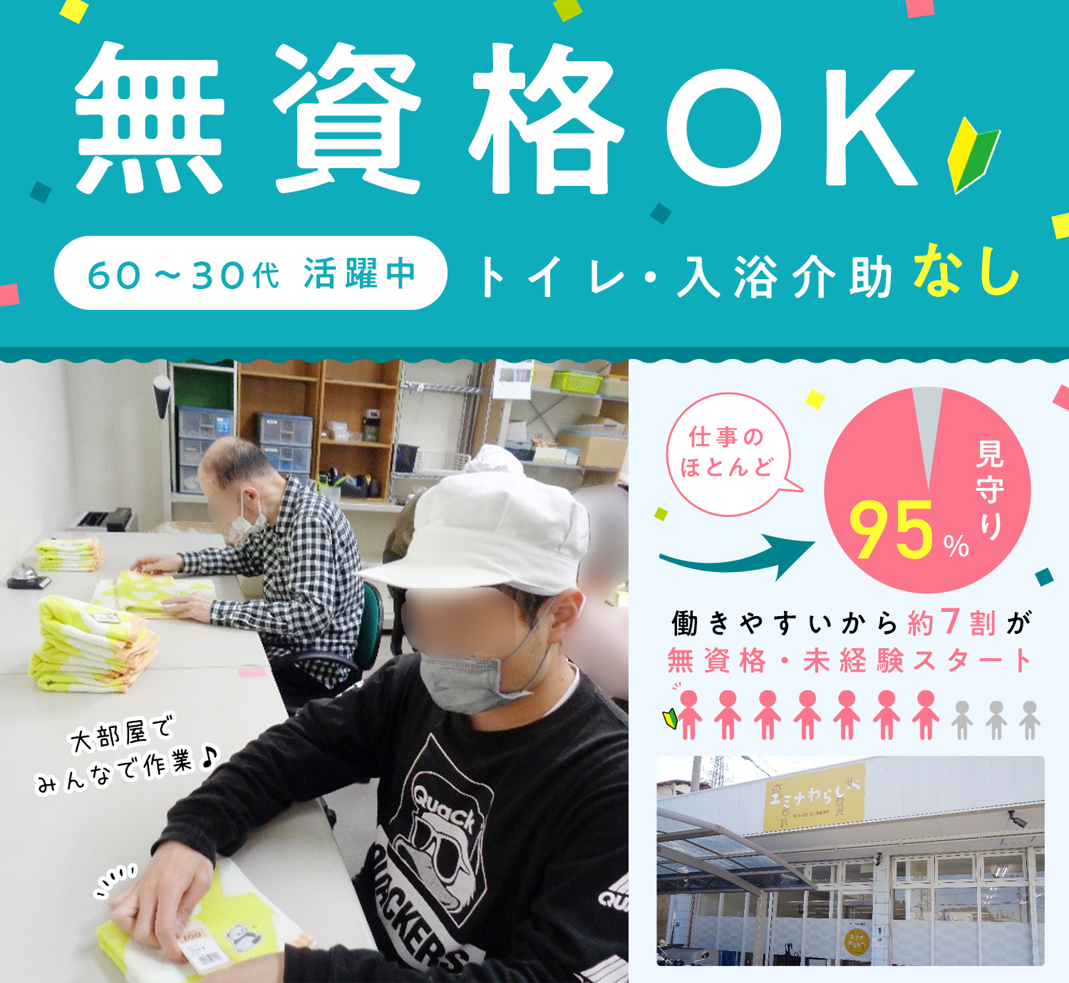 | 応募資格 | 無資格・未経験OK #ブランクOK 障がい者支援が初めての方も大歓迎 介護・福祉系の有資格者・経験者は優遇 ※軽作業や事務等から転職OK! ※普通自動車免許(AT限定可)必須 |