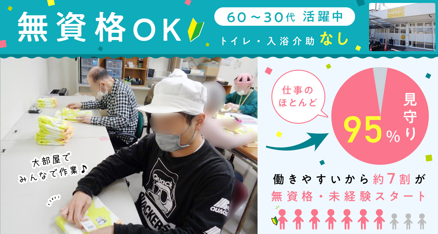 | 仕事内容 | 介護職/見守り・サポート・日中活動[契] 知的障がいを持つ利用者様の日中活動の見守り、作業補助、 余暇活動(レクリエーション)、送迎業務などをお願いします。 ・未経験スタートが全体の7割(無資格OK) ・お任せする業務は<見守り・サポート…95% /身体介助…5%>の割合 ・トイレ、入浴の介助は一切なし! ・60〜30代の幅広いスタッフが活躍中! ・送迎業務(特に夕方)が可能な方歓迎! ※・送迎車…セレナ(ミニバン)を使用(AT限定可・カーナビ付) ・送迎エリア…枚方市 送迎に行くのは施設から10~15分くらいの範囲内。 狭い道や難しい道もありません。 慣れるまで先輩が同乗します。 <余暇活動の一例> ・クリスマスパーティー ・日帰り旅行 ・忘年会 ・各種レクリエーション <日中の基本的なスケジュール> 08:30 出勤・朝礼 08:40 送迎 10:00 朝の会/見守り・補助 12:00 お昼 13:00 見守り・補助 15:30 終礼 16:00 送迎、掃除、片付け 17:30 終業(残業ほぼなし)!お疲れさまでした! |