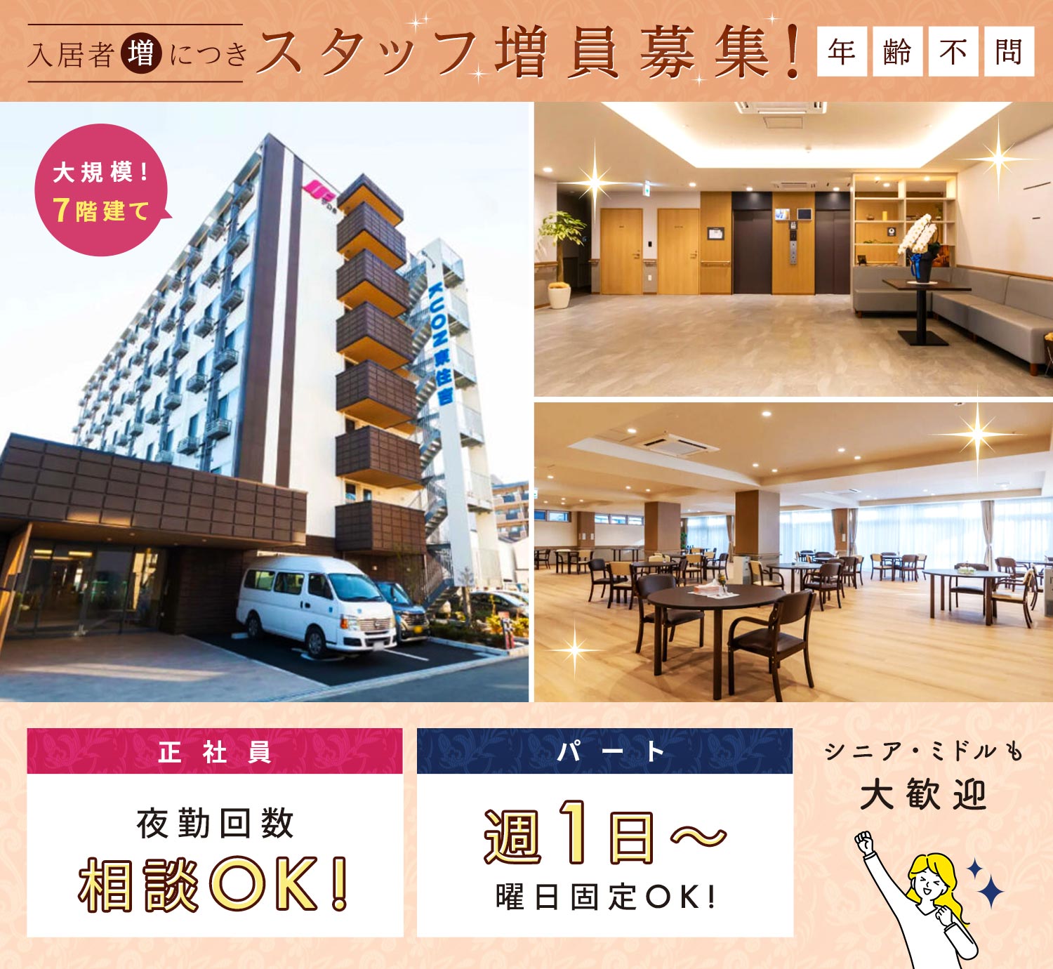 | 応募資格 | 介護職員初任者研修修了(旧ヘルパー2級)以上 #ブランクOK ※男女ともに歓迎 ※実務経験不問 ※学歴不問 □□□ ※年齢不問!シニアやミドルも歓迎 |