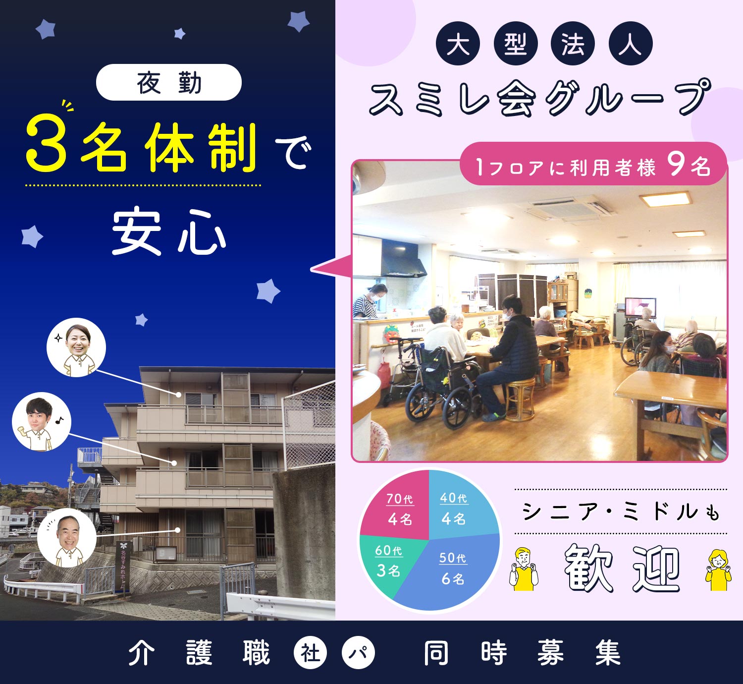 | 応募資格 | 無資格・未経験OK!有資格者は優遇 #ブランクOK ※学歴・年齢不問(シニアやミドルも歓迎) ※介護職員初任者研修修了以上や介護福祉士お持ちの方、介護経験者も歓迎 |