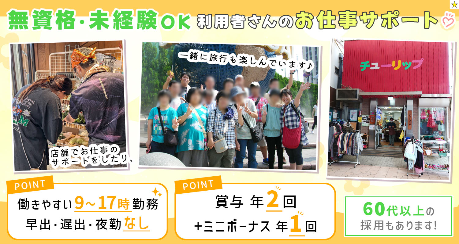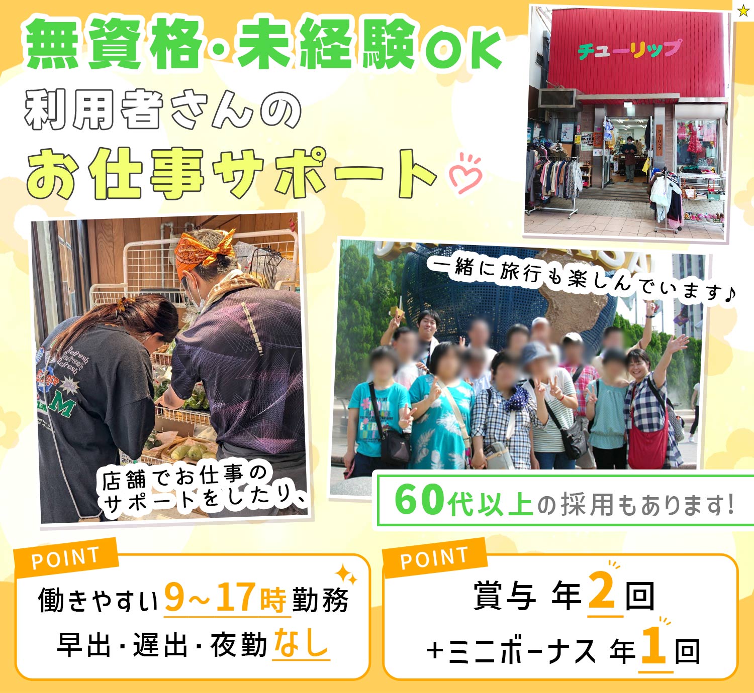 | 仕事内容 | 生活支援員/事務等から転職OK[契] 主に知的障がいのある18歳以上の方への日中活動のサポート。 (利用者様への作業支援、食事・排泄介助、記録の作成、他) <作業> ・販売所でリサイクル品の販売 (値付けや値札作成、接客販売も行います!) ・その他、軽作業もあり 利用者様の中には作業がなかなか上手に出来なかったり、周囲とのコミュニケーションはちょっと苦手…という方もいらっしゃいます。 それでも、私たちスタッフとの関わりの中で少しずつ出来る事が増えたり、信頼関係を築くことで些細な感情の変化を読み取れるようになったり、たくさんの成長ややりがいを感じることができる仕事です◎ <1日の流れ例> 9:00 朝礼・利用者様受け入れ 10:00 利用者様との作業・生活支援(接客・販売サポートなど) 12:00 休憩 13:00 利用者様との作業・生活支援(接客・販売サポートなど) 15:00 利用者様送迎 15:30 終礼・掃除・事務作業 17:00 退勤 |