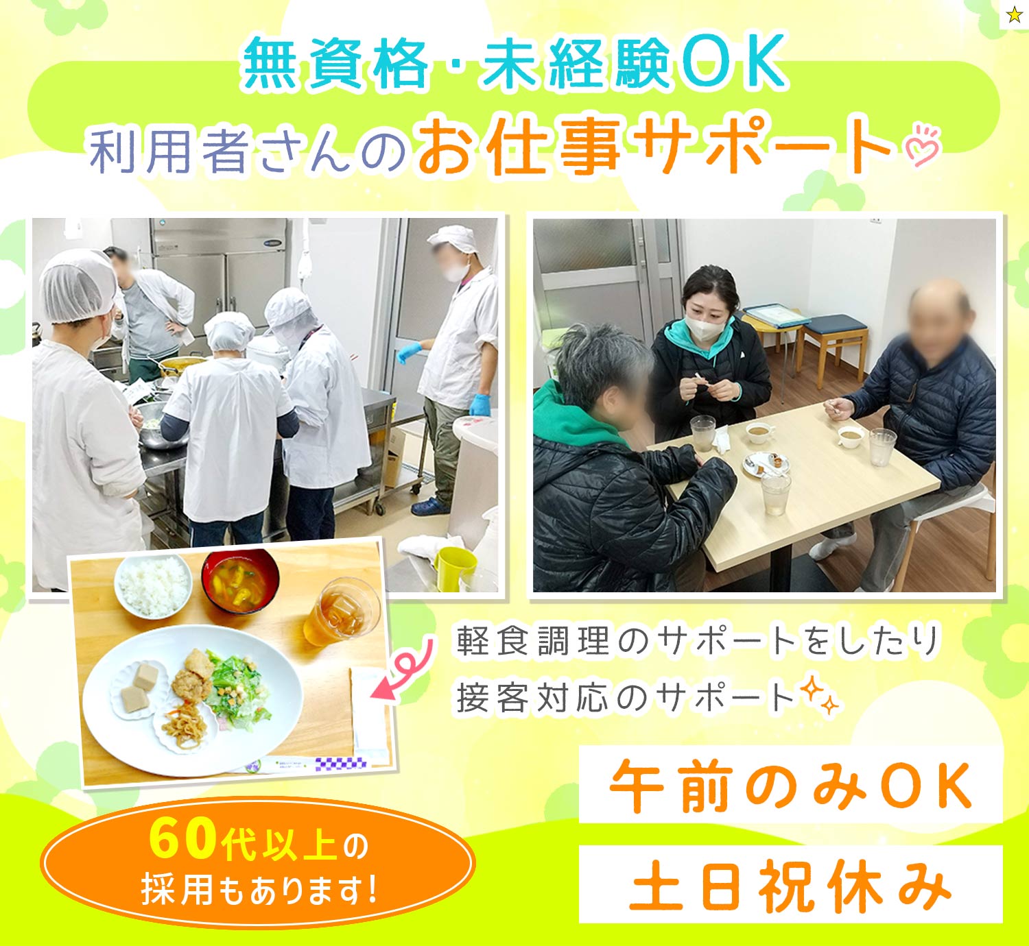 | 応募資格 | 無資格・未経験OK #ブランクOK ※障がい者支援未経験OK ※事務・飲食・美容師・販売・営業など、異業種からの転職も歓迎 ※普通自動車免許(AT限定可)お持ちの方は尚可 |