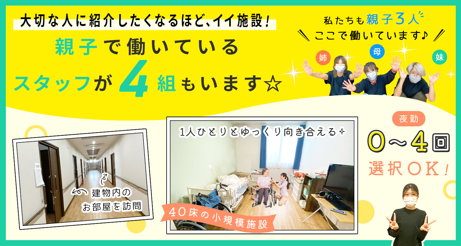 | 仕事内容 | (1)介護職/夜勤なし[社] (2)介護職員[社] 40床の小規模施設(サービス付き高齢者向け住宅)にて、 入居者様の生活のサポート(食事・口腔ケア・入浴・身体介助など)をお願いします。 ※身体介護と生活支援の割合は、おおよそ6:4 ※介護記録はタブレットで入力 紙の記録に比べてスピーディーでかんたん!慣れていない方もスグに使いこなせますよ。 入居者様のケア中に分からないこと・不安なことがあれば、いつでも連絡や声掛けができる体制! 優しいスタッフばかりなので、遠慮なく頼ってくださいね。 |