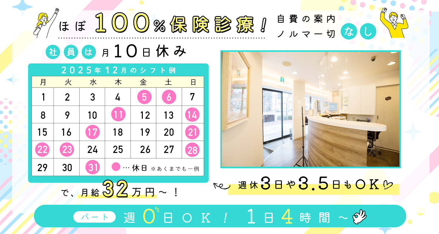 | 応募資格 | 歯科衛生士資格 #ブランクOK、実務未経験OK ※年齢不問(シニアやミドルも歓迎) ※今春新卒(専門・短大・大学)、第二新卒歓迎 |