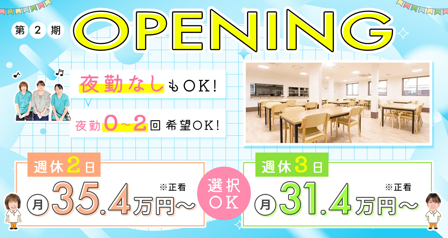 | 仕事内容 | (1)第2期オープニングの看護師/週休3日[社] (2)日勤のみ看護師/週休3日[社] 定員49名の完全新築OPEN、住宅型有料老人ホームにて、 医師やケアマネとの連携を図りながら、医師の指示に基づく処置、病状観察、リハビリケアなどをお願いします。 |