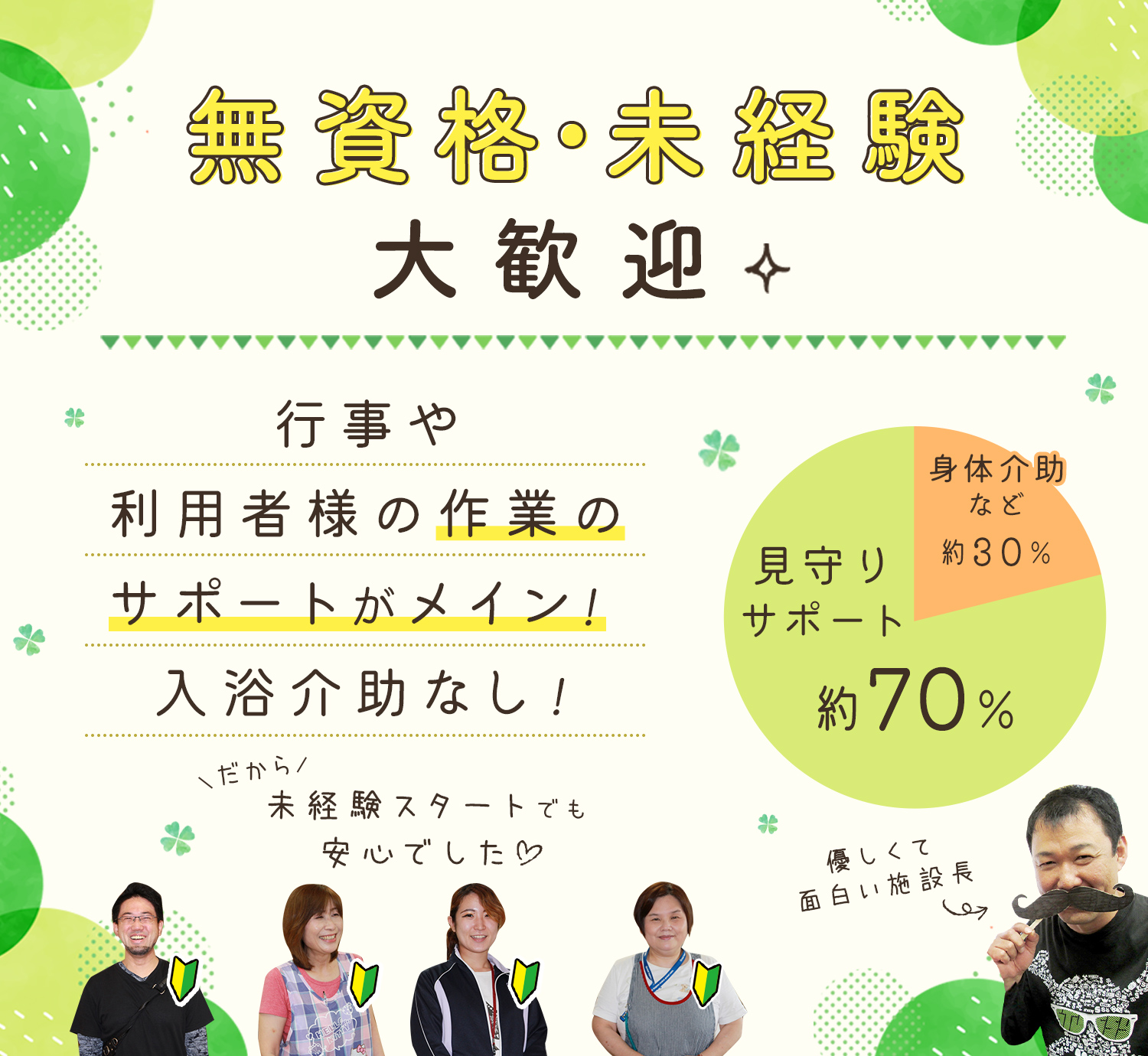 『入浴介助なし』『夜勤なし』なので、無資格・未経験でも始めやすいですよ☆