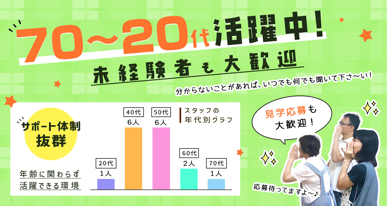 | 応募資格 | 無資格・未経験OK ※シニア・ミドルも歓迎 ※学生も歓迎 ※年齢不問 |