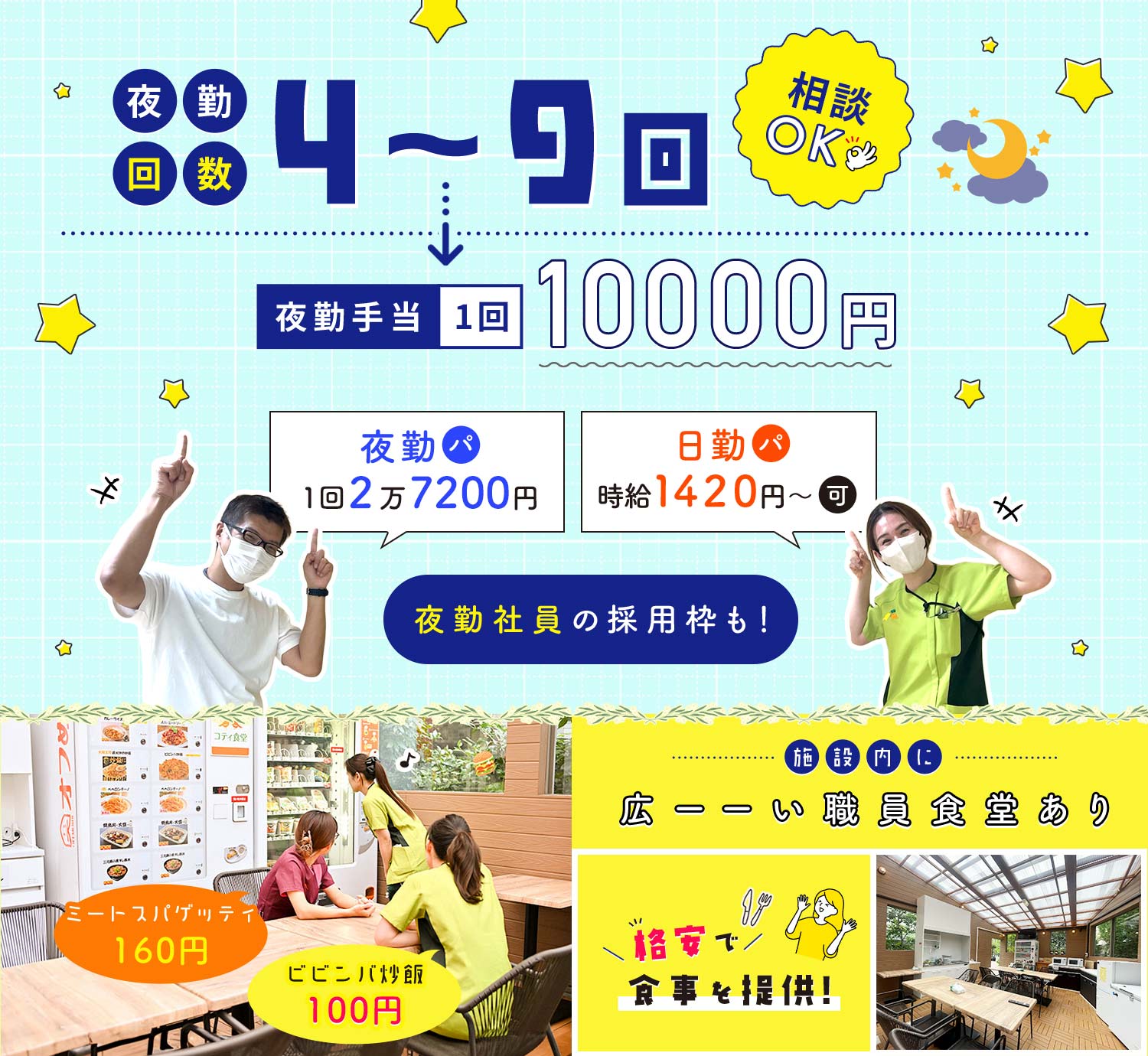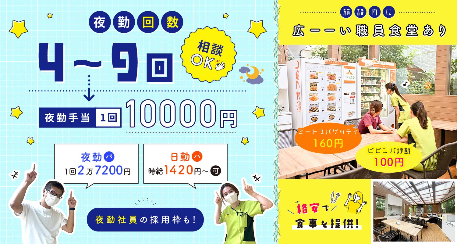| 仕事内容 | 夜勤専従の介護職/週1日OK[パ] 特別養護老人ホームおよびショートステイでの夜間の介護業務全般。 就寝前のケアや就寝後の見回り、排泄介助などをお願いします。 ★利用者様との距離が近い 特養は利用者様10名の少数制でケアを行うユニット型☆ 従来型の特養では利用者様全員を職員全員で担当する為、お一人おひとりと関わる時間は短くなりがちですが、ユニット型の場合、生活リズム等に合わせながら接することができるので、じっくり時間をかけて、利用者様に向き合えます! |