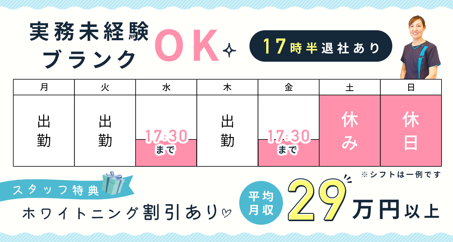 | 待 遇 | #賞与あり 年2回 ※年3ヶ月分(初年度1ヶ月分) #昇給あり 年1回 歯科医師国保・雇用保険・労災保険・厚生年金 交通費規定支給 自転車・バイク通勤OK(無料駐輪場完備) iDeCo加入 退職金制度 外部講習費規定支給 #社割あり (自費診療20%OFF!他、無料特典もあり) スタッフ休憩室あり(冷蔵庫、電子レンジ、ケトルあり) 制服貸与 医院イベントの自己負担なし ※過去には千葉の夢のテーマパーク、城崎温泉や湯布院等に行きました! 勉強会・セミナー参加OK |