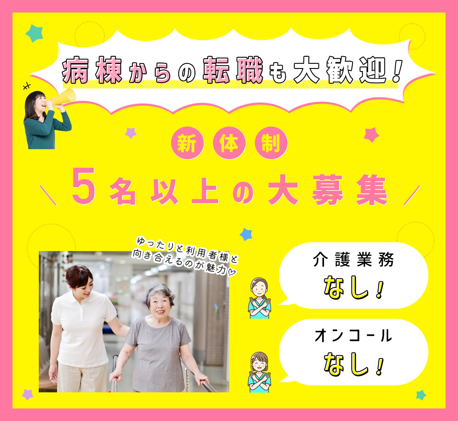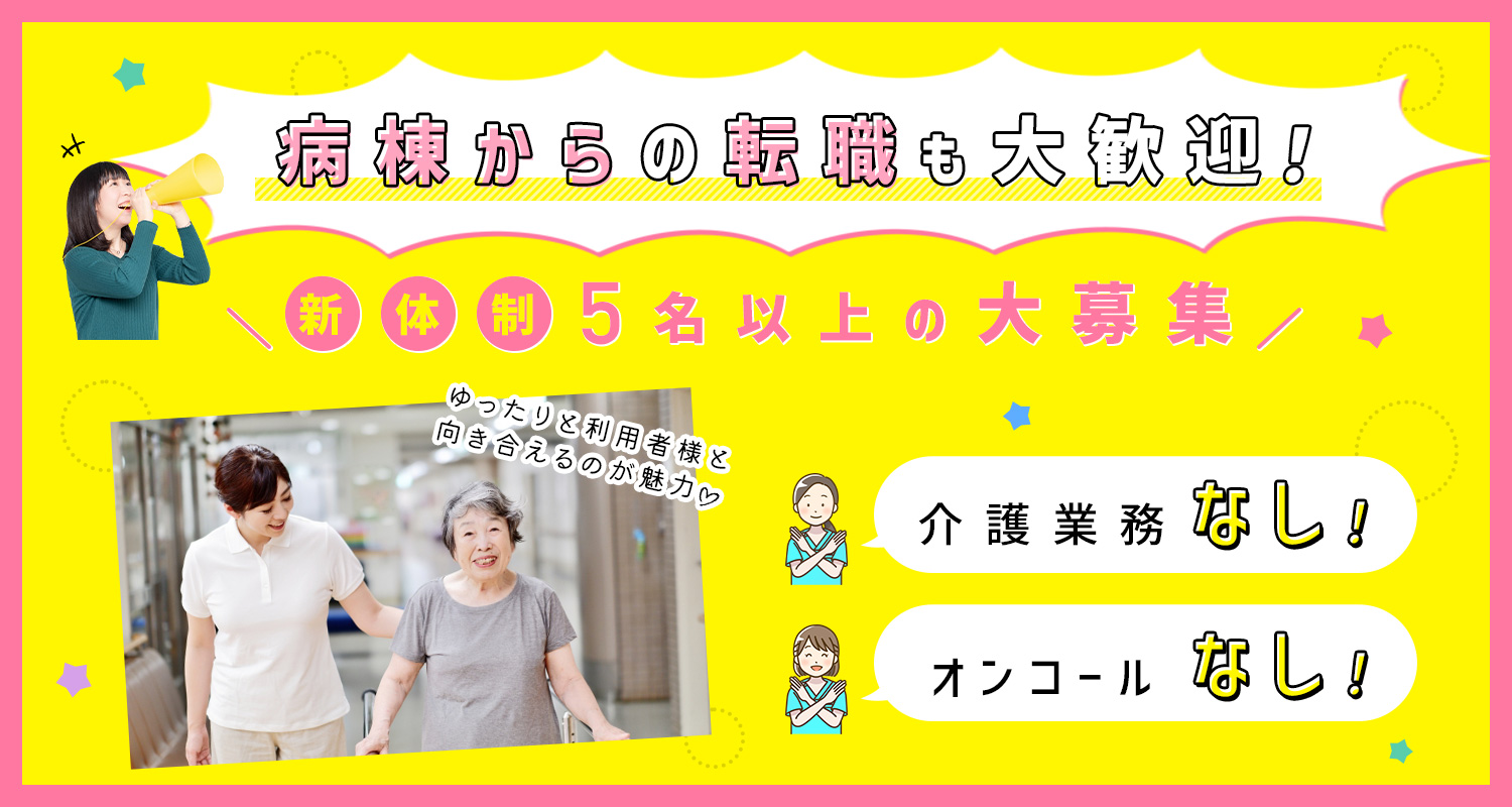 | 応募資格 | 正・准看護師 #ブランクOK(10年以上のブランクもOK) ※福祉施設での勤務未経験OK ※普通自動車免許(AT限定可)をお持ちの方は歓迎(運転免許がない方も応募OK) |