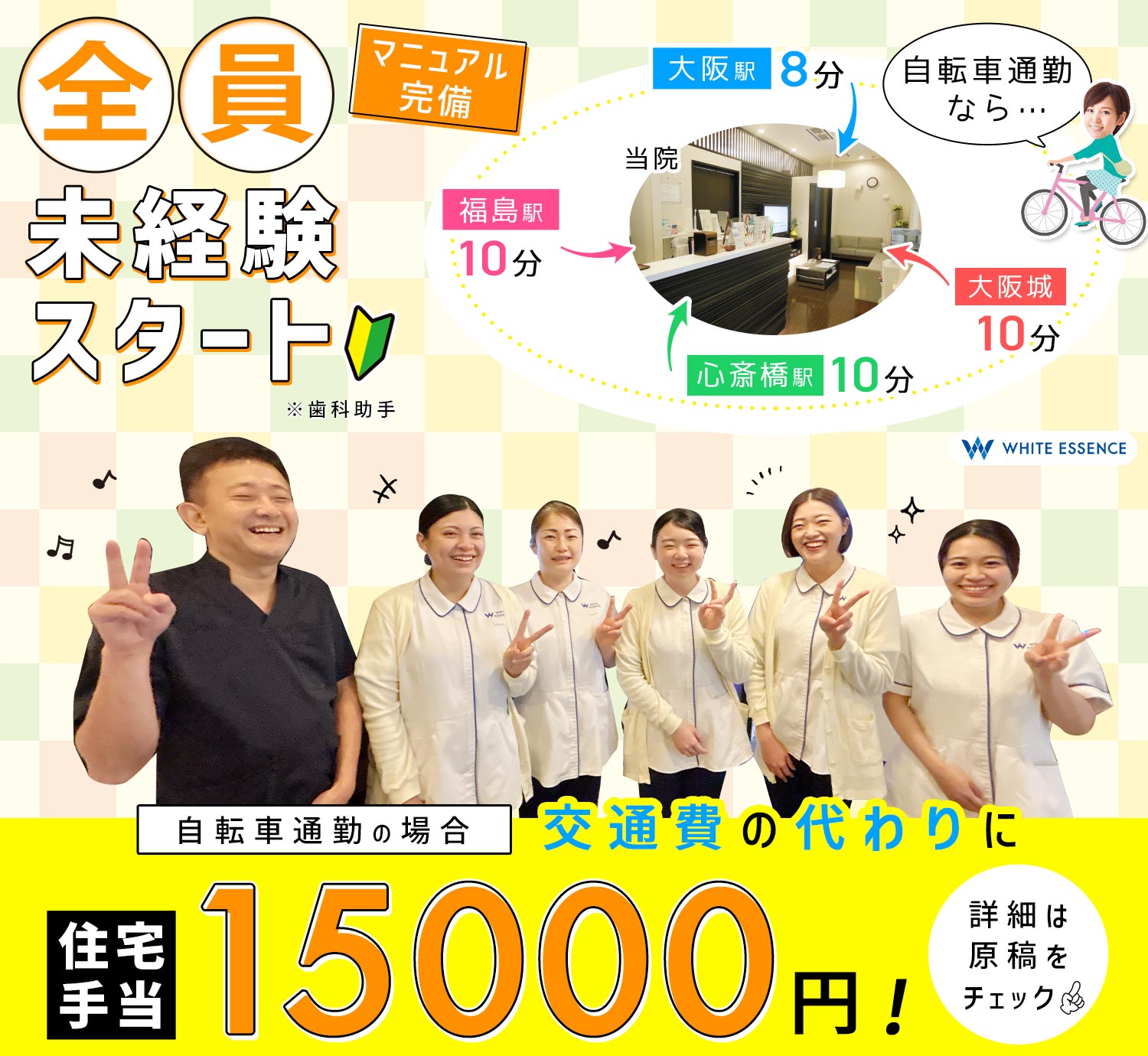 | 待 遇 | #賞与あり 年2回(実績による) #昇給あり 年1回(評価により、最大5万円!) 交通費規定支給(月2万円迄)もしくは住宅手当(月15000円)どちらか支給 ※パート勤務の場合も、交通費と同等額支給 引越し費用一部負担※規定あり 社会保険完備 退職金制度(勤続4年以上) 制服貸与 矯正などスタッフ特典あり デンタルエステ無料 スタッフルーム完備(冷蔵庫・個別ロッカーあり) 院内・院外の勉強会あり(希望者) 資格取得支援あり(ホワイトエッセンスの認定資格など) 賠償責任保険加入 診療マニュアルあり eトレーニングシステム(タブレット・スマホで学べる動画研修ツール) ※各種規定あり |