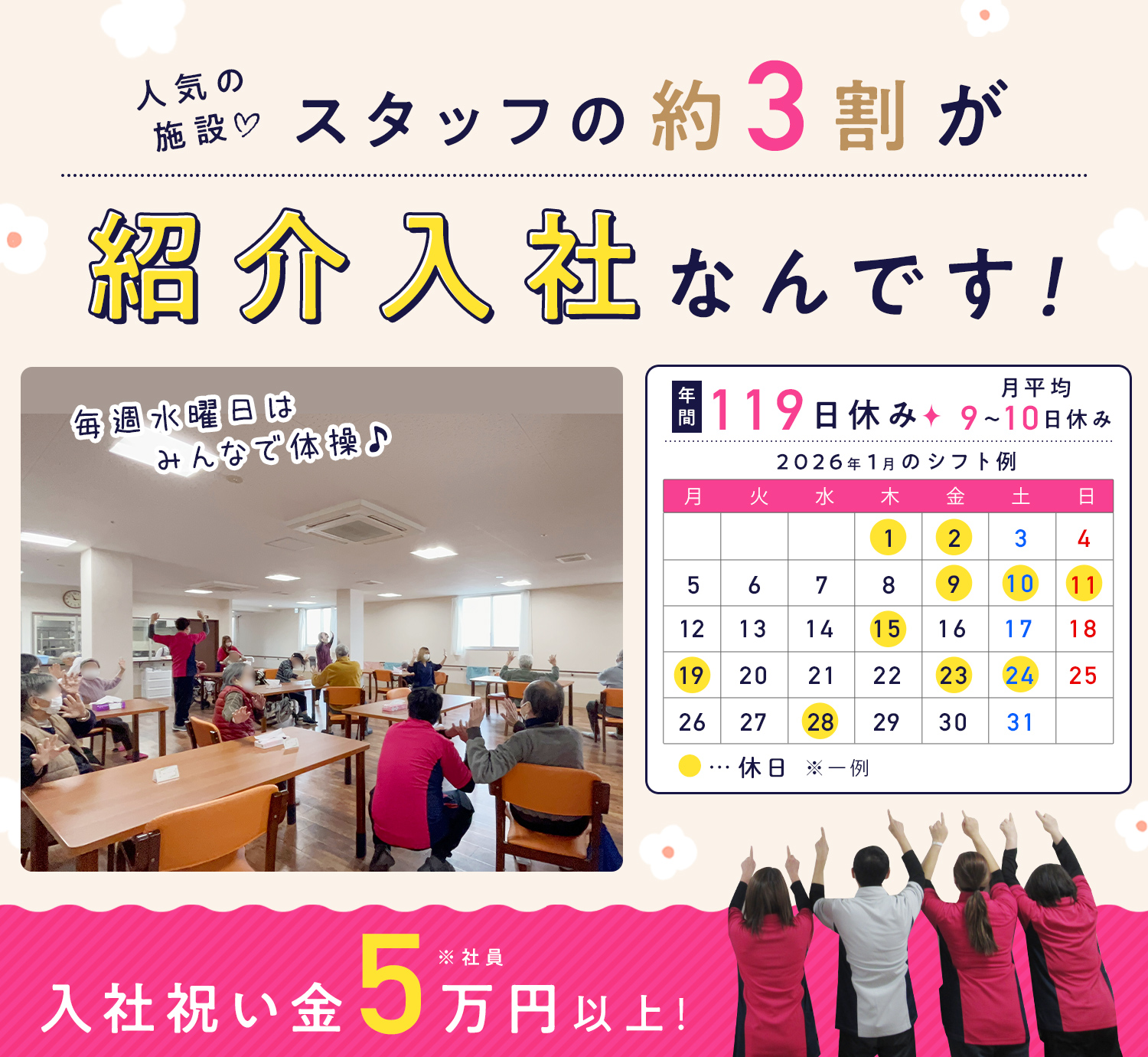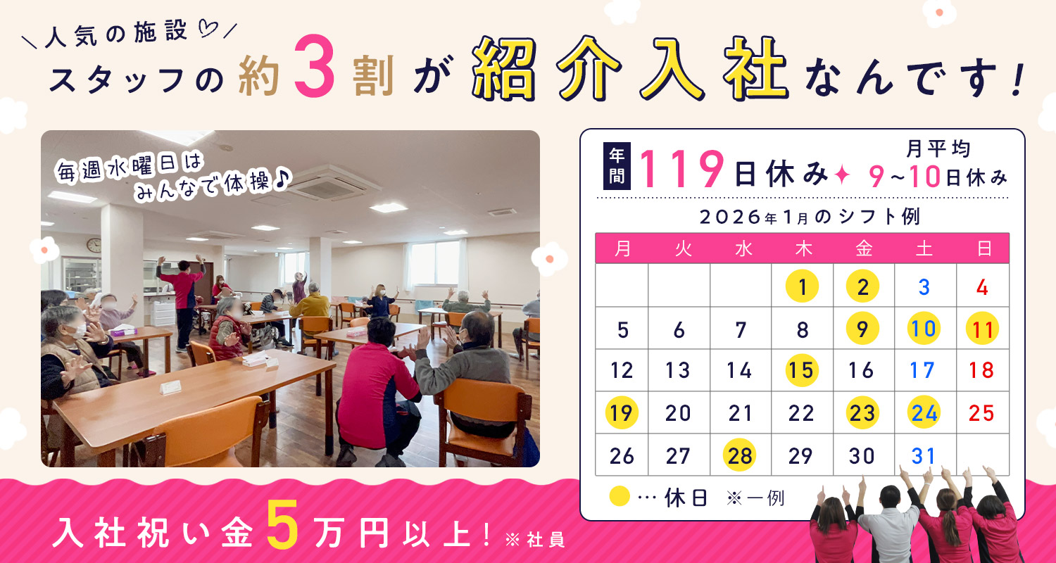 紹介での入社が全体の約3割もおり、スタッフから選ばれる人気の施設です☆