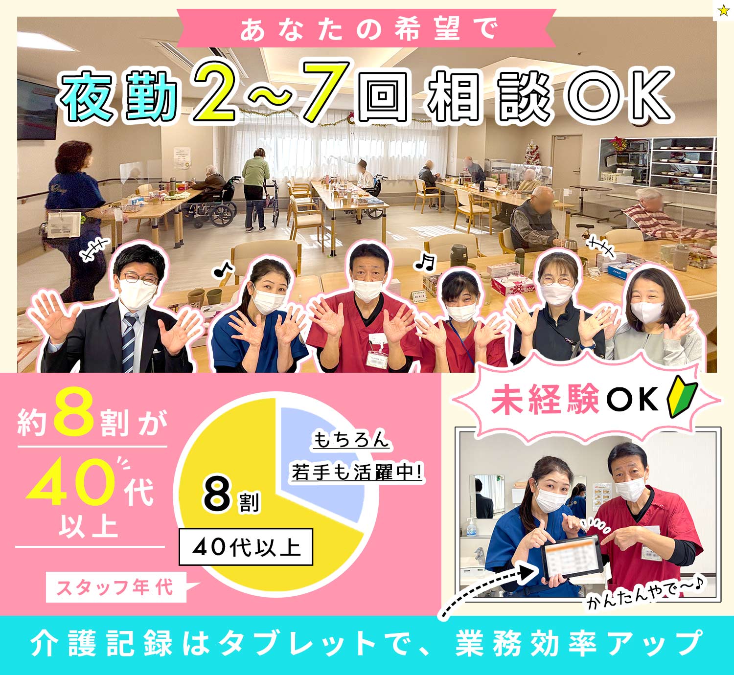 | 仕事内容 | 介護職/夜勤2回からOK[社] 全38床の住宅型有料老人ホームで、施設内の居室へ訪問しての身体介助(食事・入浴・おむつ・シーツ交換)や生活介助(洗濯、掃除など)、レクリエーションの企画と実施をお願いします。 ■24時間看護師常駐 日常の健康相談から緊急時の対応まで、医療面について24時間サポートできる安心の環境です。 ■介護記録にはスマホやタブレットを使用 記録作業がカンタンに行えるとスタッフにも好評です! |
