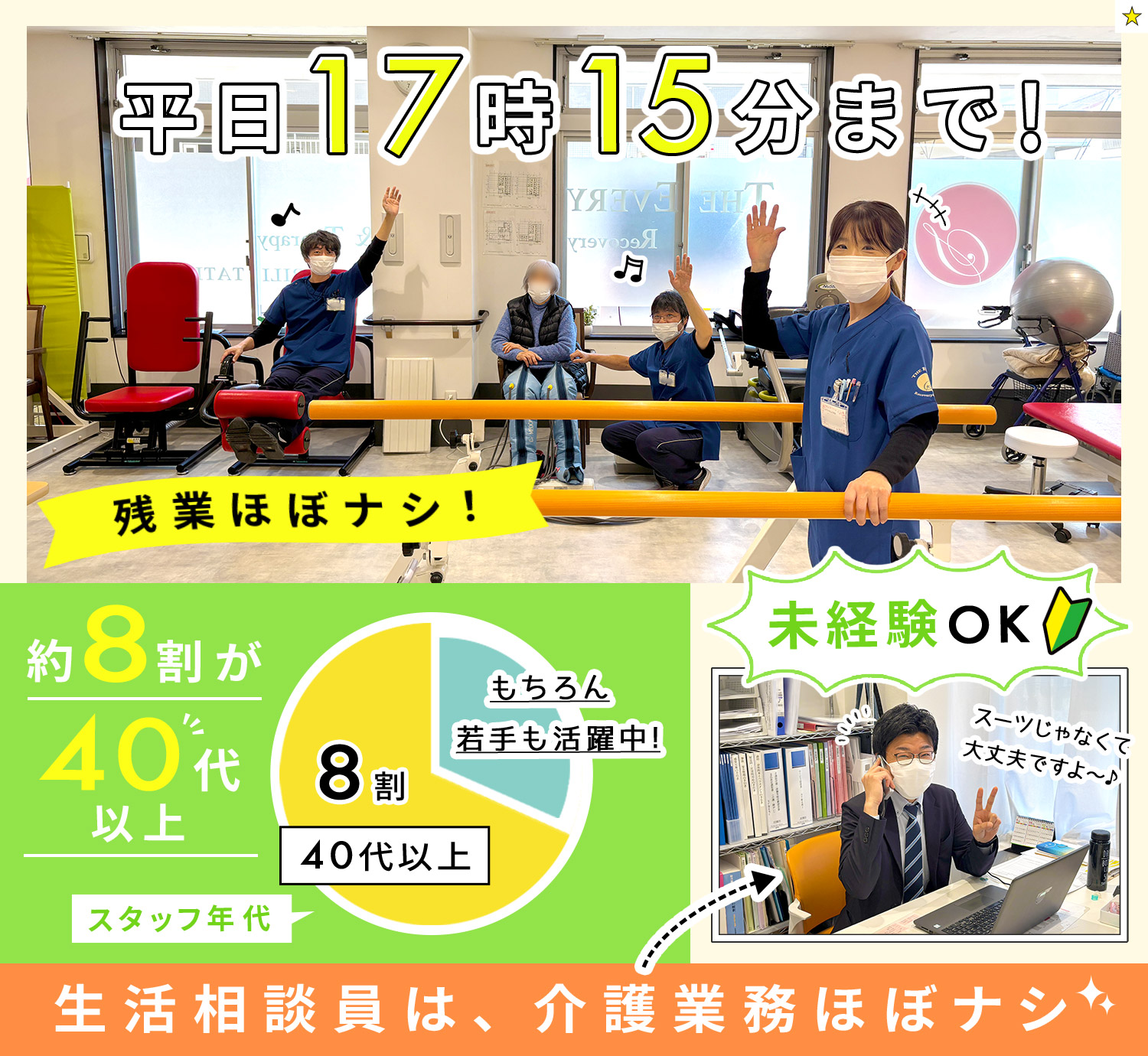 障がいリハも行っている当施設では、ケガなどから社会復帰をめざしてリハビリに通う方もおり、