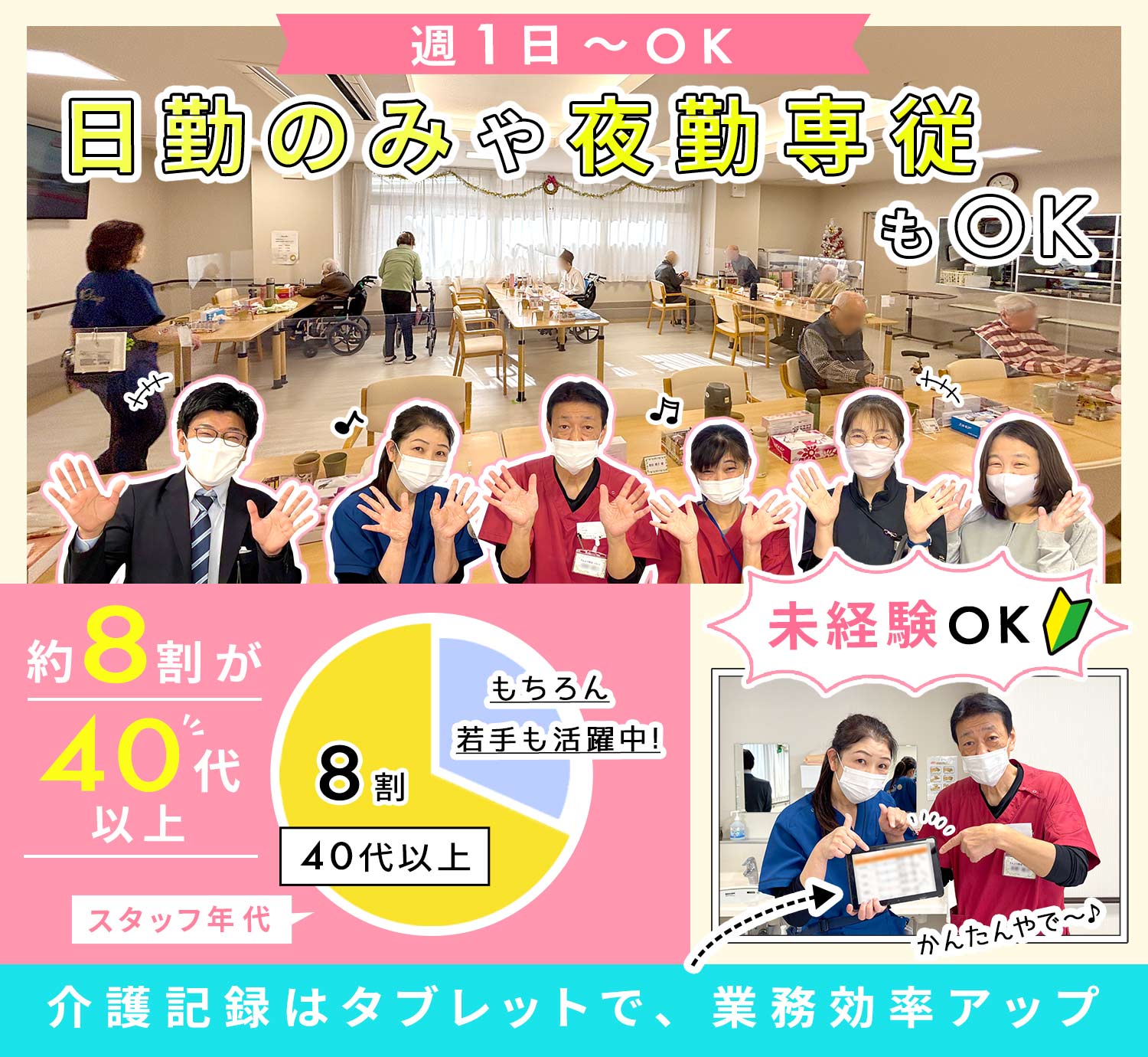 | 待 遇 | 社会保険完備(法定通り) 交通費規定支給(月2万円まで) 資格取得支援制度(初任者研修・実務者研修・介護支援専門員/補助金あり) お誕生日プレゼント(商品券3000円分) #車通勤OK (駐車場あり※1日150円で利用可) バイク・自転車通勤OK 受動喫煙対策あり(屋内禁煙※屋外喫煙上あり) 制服貸与 定年60歳 再雇用制度あり(65歳まで) |