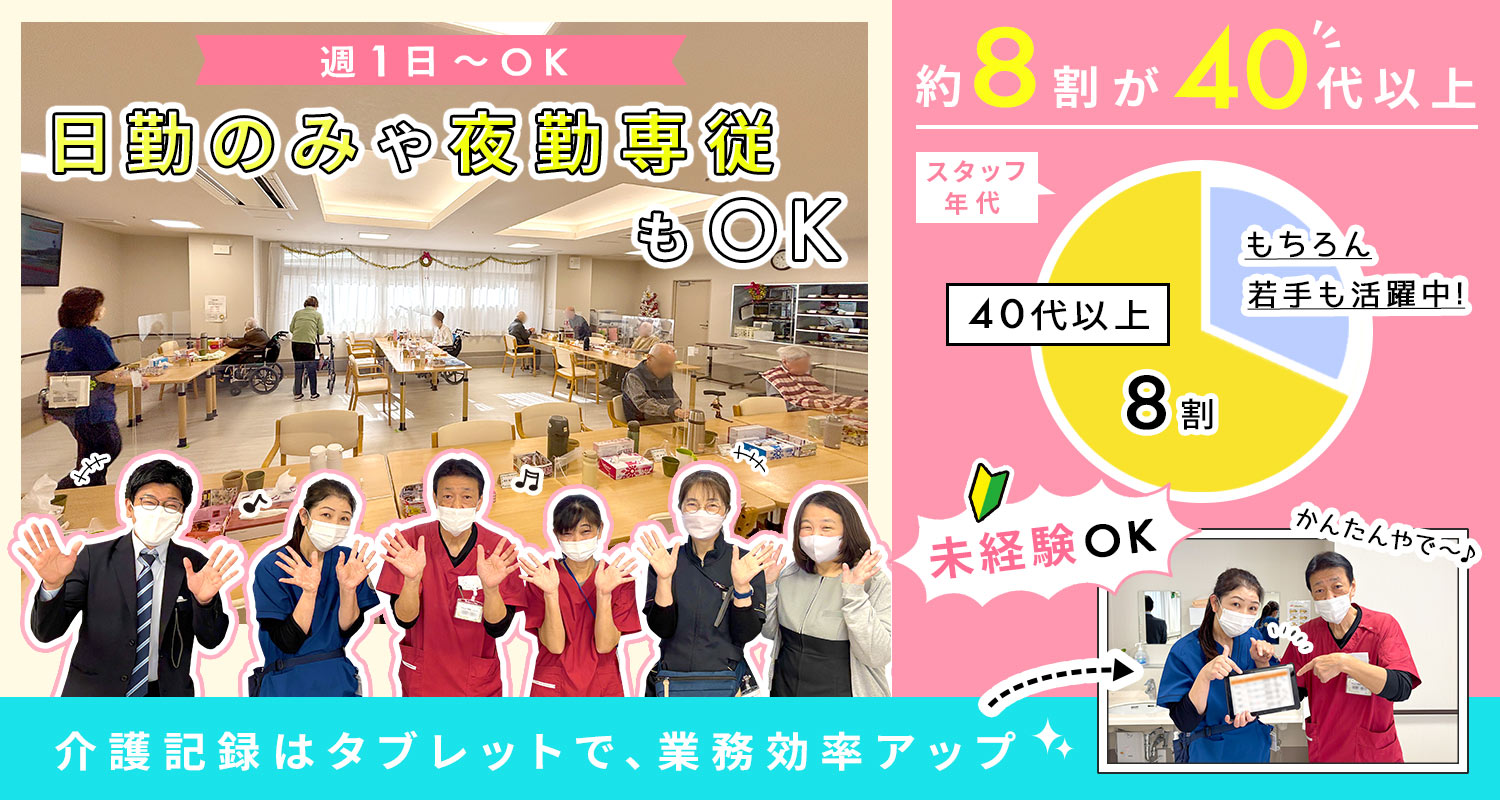 | 仕事内容 | (1)週1日OKの介護職/日勤のみ[パ] (2)週1日OKの介護職/夜勤専従[パ] 全38床の住宅型有料老人ホームでの勤務となります。 (1)施設内の居室へ訪問しての身体介助(食事・入浴・おむつ・シーツ交換)や生活介助(洗濯、掃除など)、レクリエーションの企画と実施をお願いします。 (2)入居者様の身の回りの介助に加え、夜間の見守りなどをお願いします。 ■24時間看護師常駐 日常の健康相談から緊急時の対応まで、医療面について24時間サポートできる安心の環境です。 ■介護記録にはスマホやタブレットを使用 記録作業がカンタンに行えるとスタッフにも好評です! |