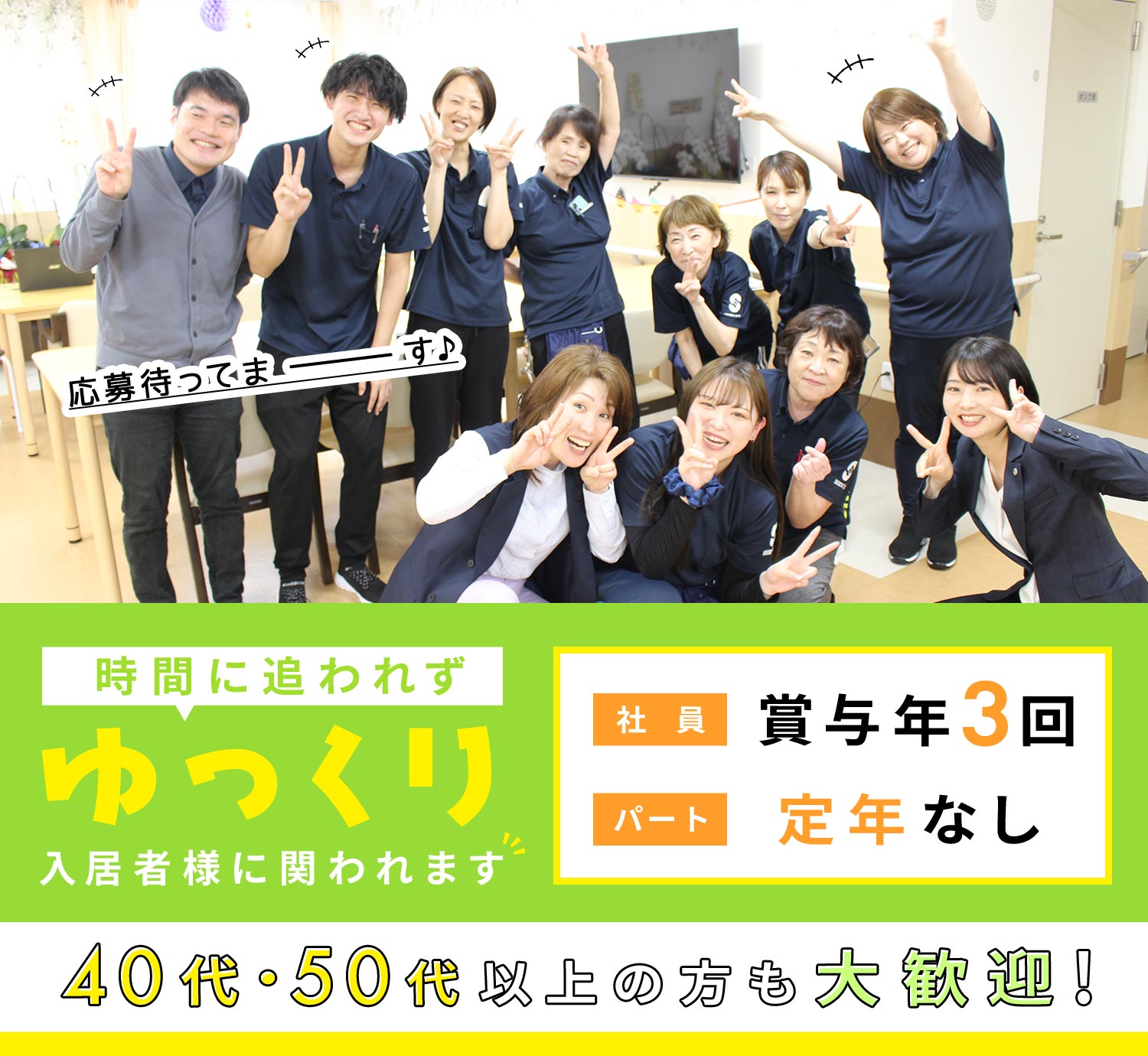 | 応募方法 | ◇ お気軽に【応募する】ボタンよりご応募ください ◎ 24時間受付中です 私服面接OK! まずは見学も歓迎!※希望者のみ 施設の雰囲気や一緒に働く仲間を見てからの応募でも大丈夫です。 □□□ 電話での応募も受付中! 「ジ ョ ブ ポ ス タ ー を見て応募したのですが」と、 お電話すると、スムーズです! |