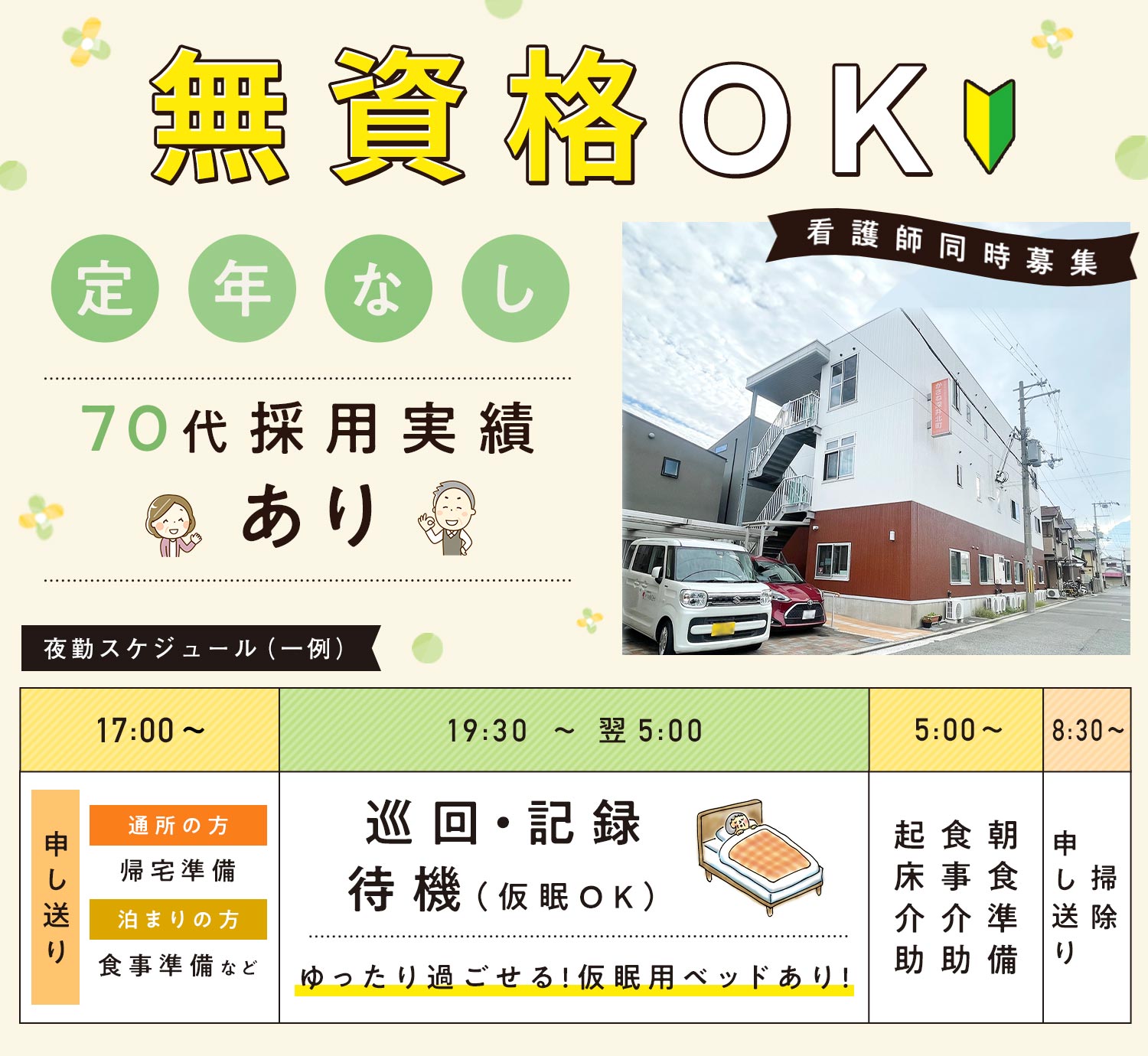 | 応募資格 | (1)正看護師 (2)准看護師 #ブランクOK ※現場未経験OK ※WワークOK ※定年なし ※60・70代採用実績あり ※ミドルやシニア歓迎 |