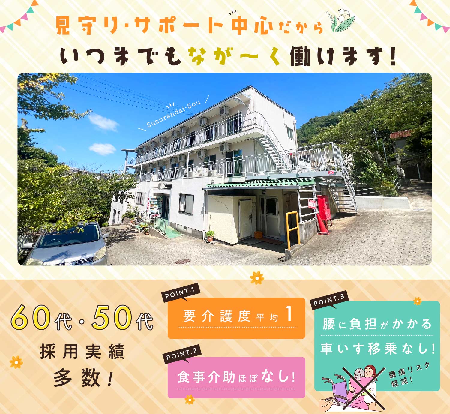 | 仕事内容 | 見守りサポート中心の介護職/シニアやミドルも歓迎[パ] 養護老人ホームで、利用者様の生活サポートをお願いします。 入浴のお手伝い、食事配膳、食後の片付け、お茶配り、洗濯、トイレ誘導、紙パンツ交換、掃除、シーツ交換など。 ※7:30~12:30の勤務の場合、基本入浴介助(入浴のお手伝い)なし! ※入浴のお手伝いは、大浴場での入浴を見守り・サポート ※機械浴が必要な方は、1日数名。更衣・ドライヤー等の入浴のサポート(週2回) ※調理業務なし 経験年数問わず、一から丁寧にお教えしますのでご安心ください! |