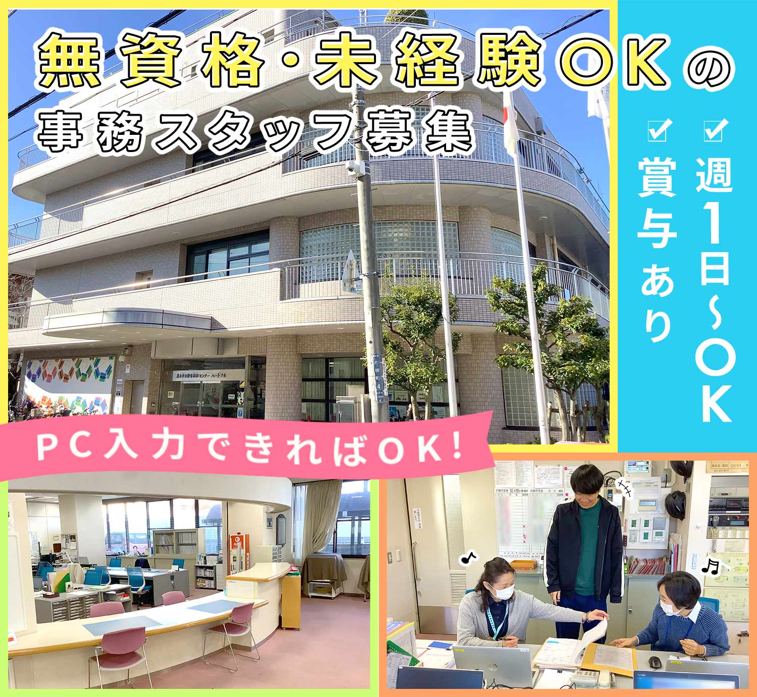 | 応募資格 | 無資格・未経験OK #ブランクOK #副業・WワークOK ※長期のブランクもOK ※年齢不問(ミドル・シニアも歓迎) ※文字入力などパソコンの基本操作・エクセルの基本操作ができる方 事務系資格や事務経験のある方も歓迎 |