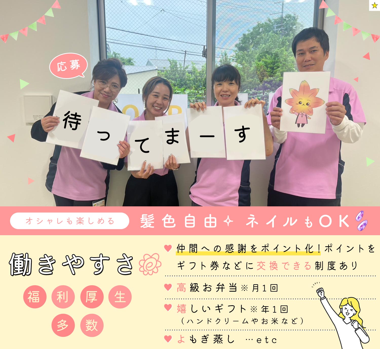 | 待 遇 | #入社祝い金あり #賞与あり (年2~3回) #昇給あり (年1回) 社会保険完備 交通費全額支給(車・バイク通勤の方はガソリン代支給※規定あり) #車通勤OK (無料駐車場完備) バイク・自転車通勤OK 早遅勤務手当(1回/1500円) 日祝勤務手当(1回/1000円) こども手当(0~3万円・18歳まで・人数制限なし※規定あり) 制服貸与 管理職へのチャレンジ制度あり 資格取得支援 資格習得試験前後の特別休暇あり 外部講習費支給 ネイル・髪色自由(業務に支障のない範囲) |