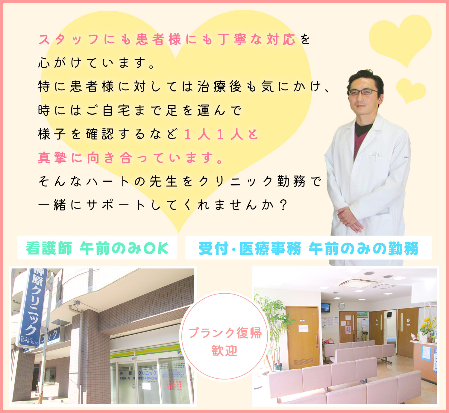 | 給 与 | 時給1900円~2000円 <詳細> 午前診/時給1900円 午後診/時給2000円 ※経験・能力を考慮 ※試用期間1ヶ月 午前診/時給1800円 午後診/時給1900円 |