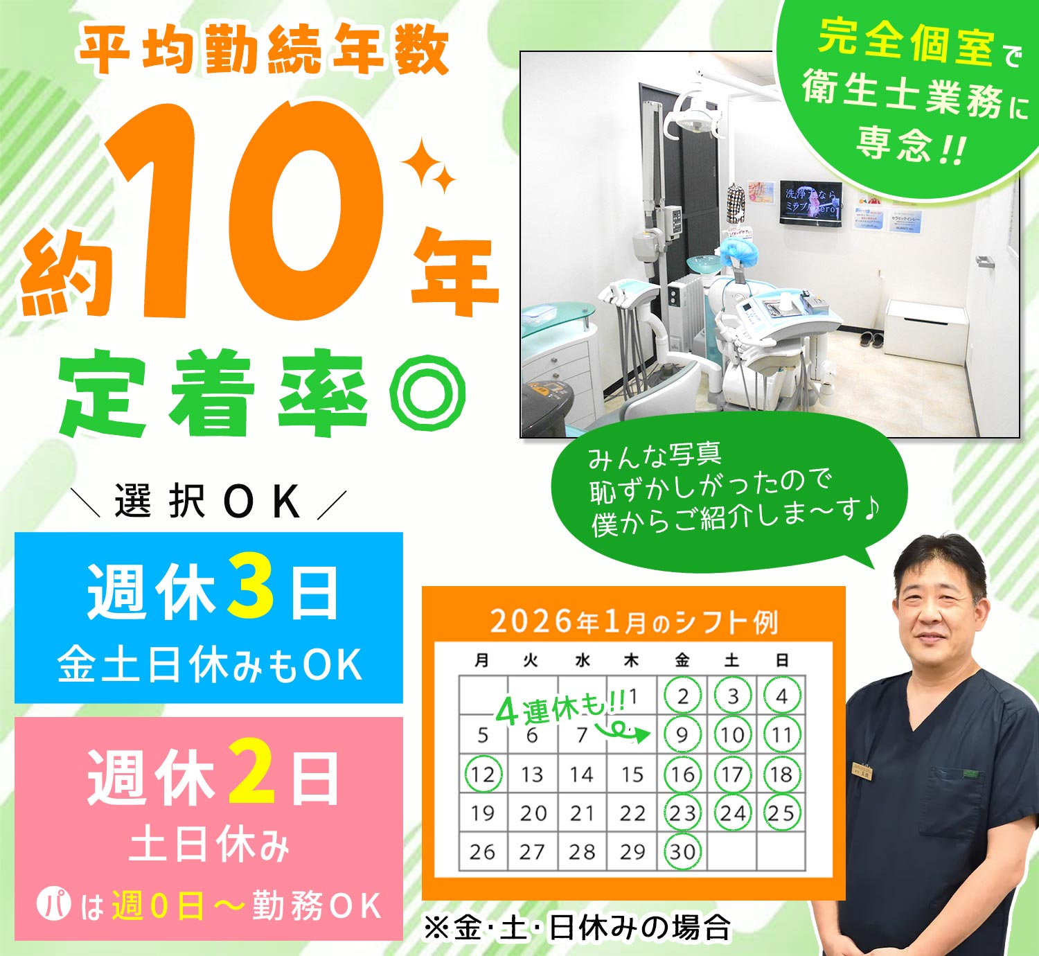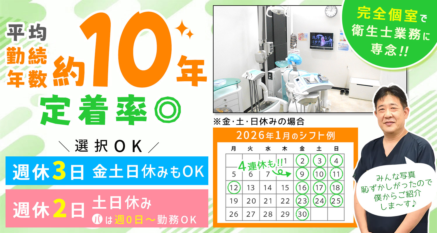 | 仕事内容 | 歯科衛生士/週0日もOK[パ] 医師のサポートや予防処置(歯石の除去や薬物の塗布)、患者様への歯磨き指導などをお願いします。 ※衛生士業務・診療アシストの割合は半々です ※成人の方からご年配の方がメインに来院されます <予防専用ユニットを完備> 全室個室で患者様とじっくり衛生士業務に集中できる環境です! |