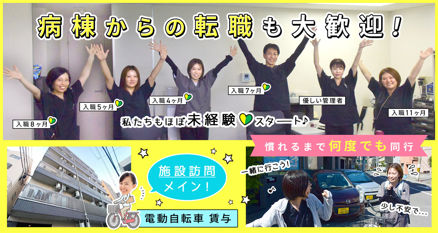 | 仕事内容 | (1)作業療法士/週1日からOK[パ] (2)理学療法士/週1日からOK[パ] 日常生活に必要な機能の回復・維持サポートや、リハビリなどをお願いします。 ※連携しているキレイな施設への訪問がメイン! 訪問エリア:事務所周辺(事務所から10分以内が主) 移動手段:電動自転車(貸与あり) ※訪問時には必ず連絡が繋がる体制 ★福祉施設への訪問メイン!移動の負担少なめ 主に連携している、キレイな福祉施設への訪問がメイン! 事業所から自転車で10分以内と移動の負担も少なめ ※電動自転車貸与 |