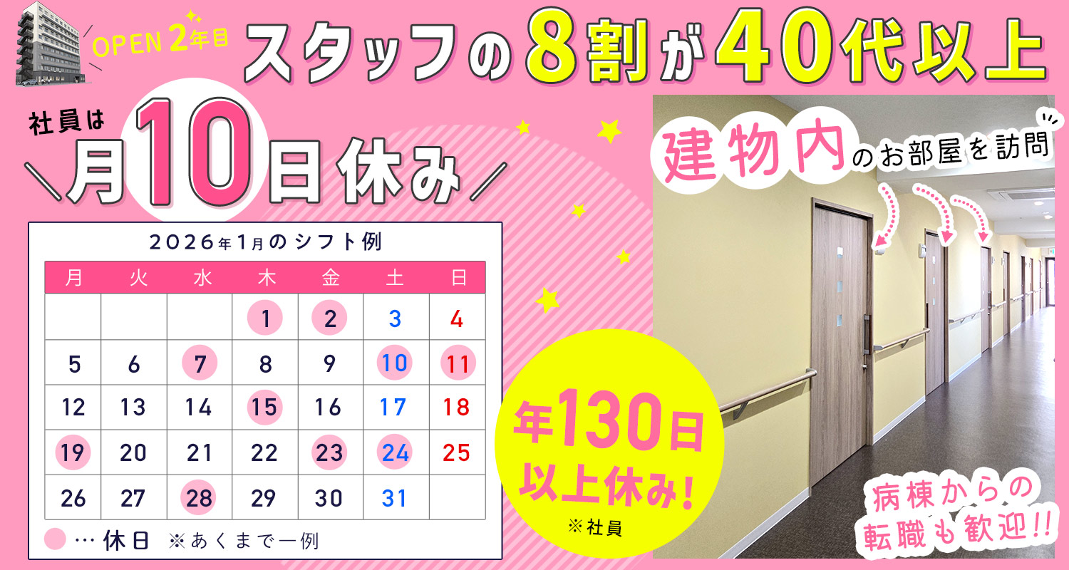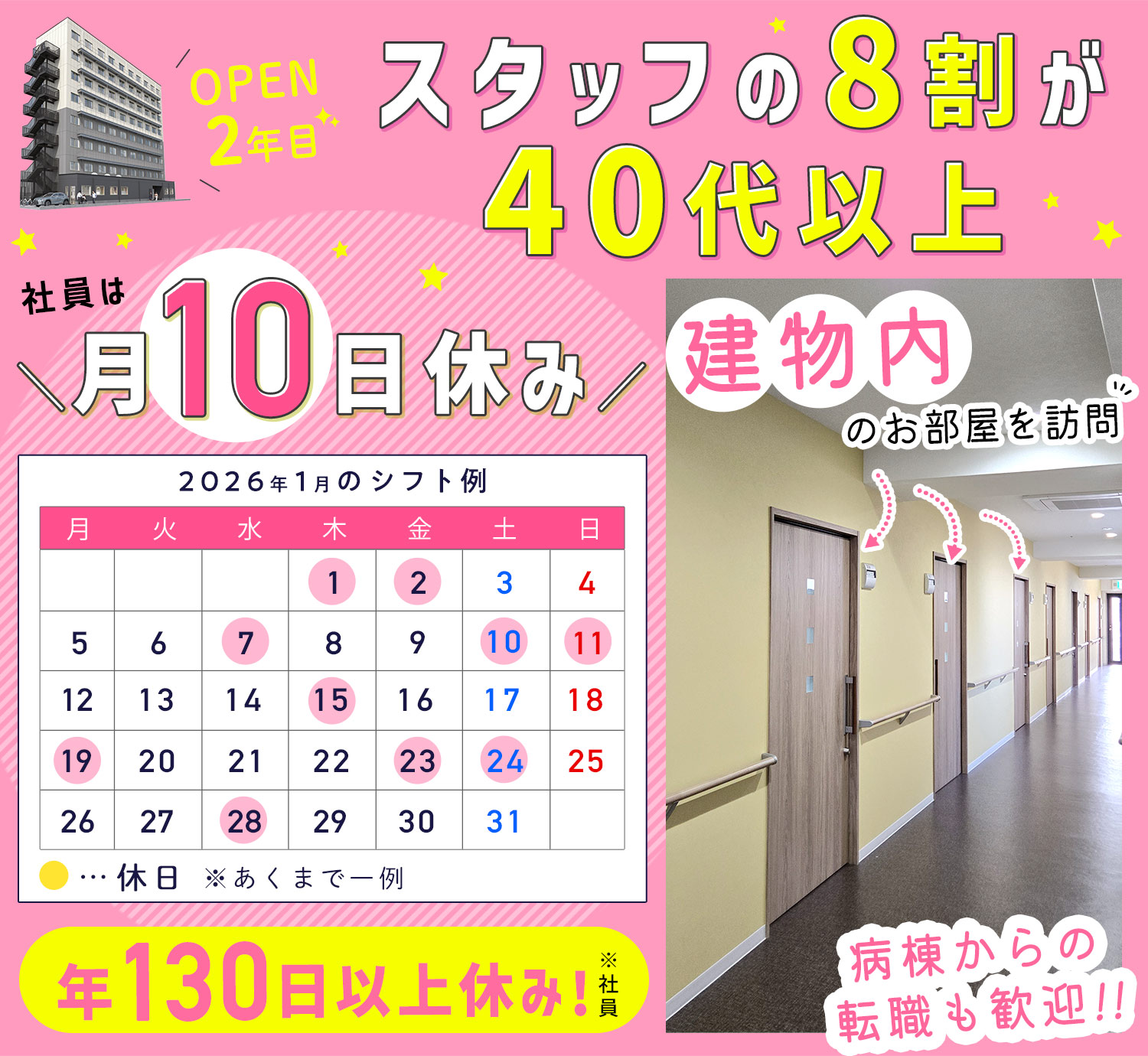 OPEN2年目の綺麗な住宅型有料老人ホームでの看護業務全般。