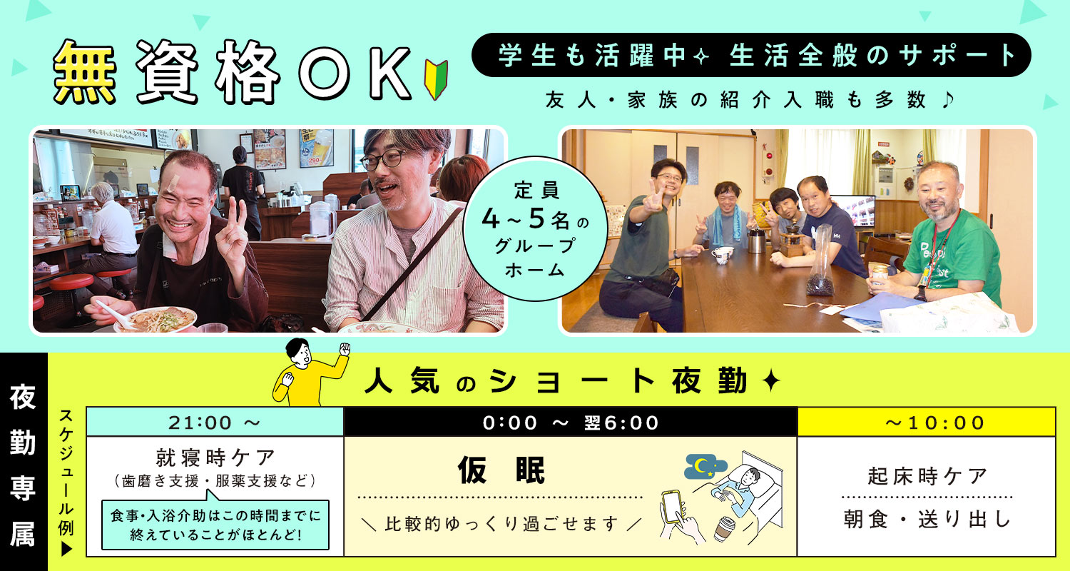 | 職 種 | グルーブホームのヘルパー(無資格OK) (1)ショート夜勤 (2)ロング夜勤 |