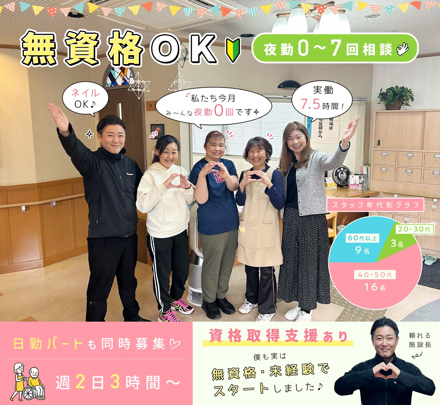 | 応募資格 | (1)(2)無資格・未経験からOK! #ブランクOK 男女・学歴不問 ※無資格の方は、入社後の半年以内に『認知症介護基礎研修』を受講していただきます。 (受講費用も会社が全額負担。受講時間も2時間半程度かつ、パソコンやスマートフォンで受けられるのでご自身のタイミングでいつでも受講可能) ※介護職員初任者研修や介護福祉士等の資格取得者は受講の必要はございません |