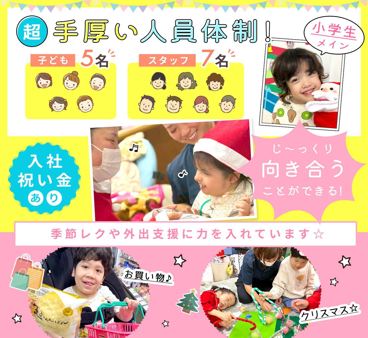 【手厚い人員体制/お子さんの人数+1~2名の職員でケア】