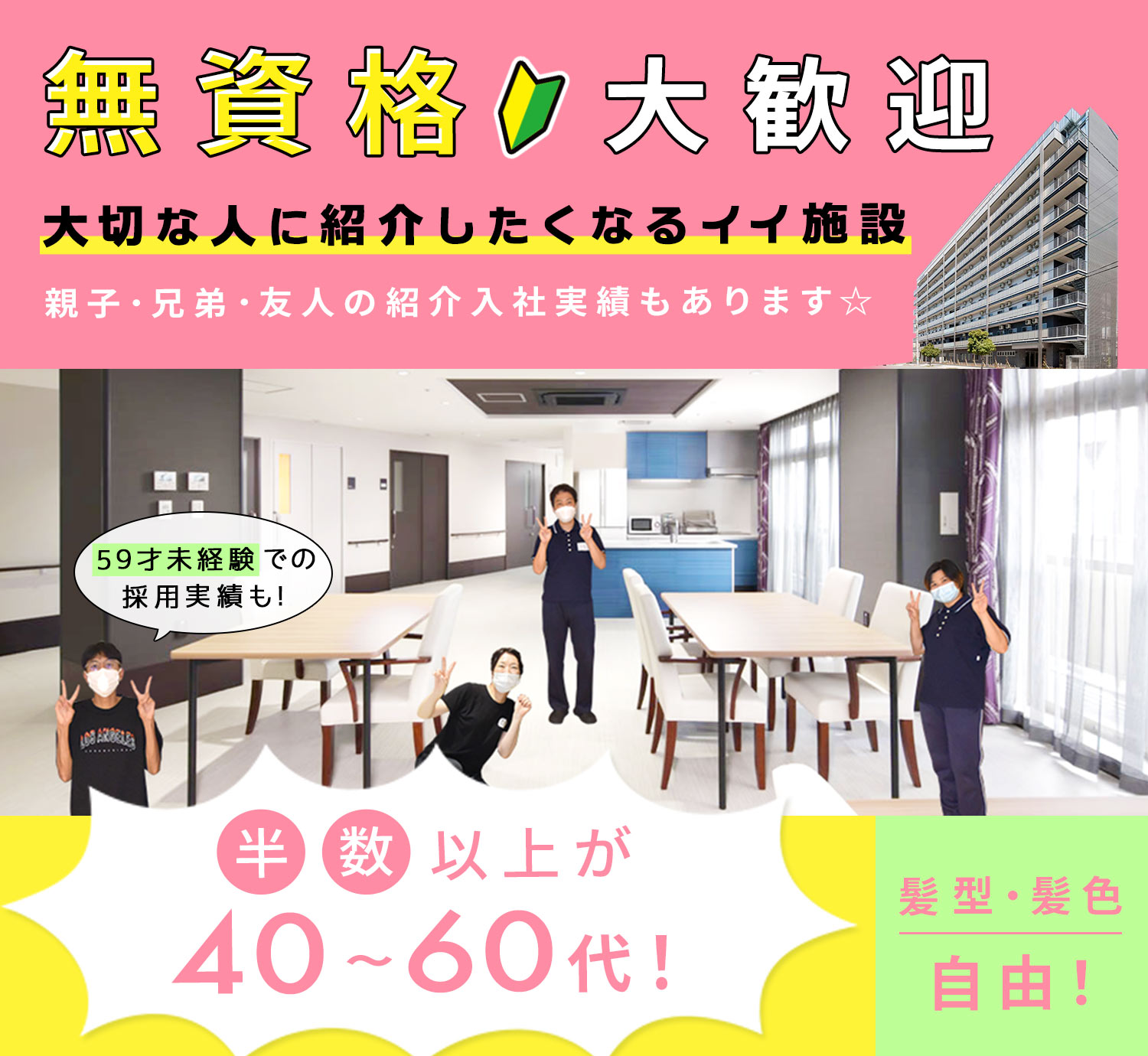 | 応募資格 | 無資格・未経験OK #ブランクOK ※シニアやミドルも歓迎 ※正社員としての勤務経験がない方もOK ※介護職員初任者研修(旧ヘルパー2級)以上や介護福祉士も歓迎 |