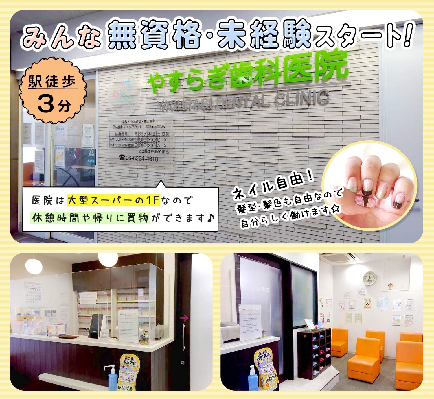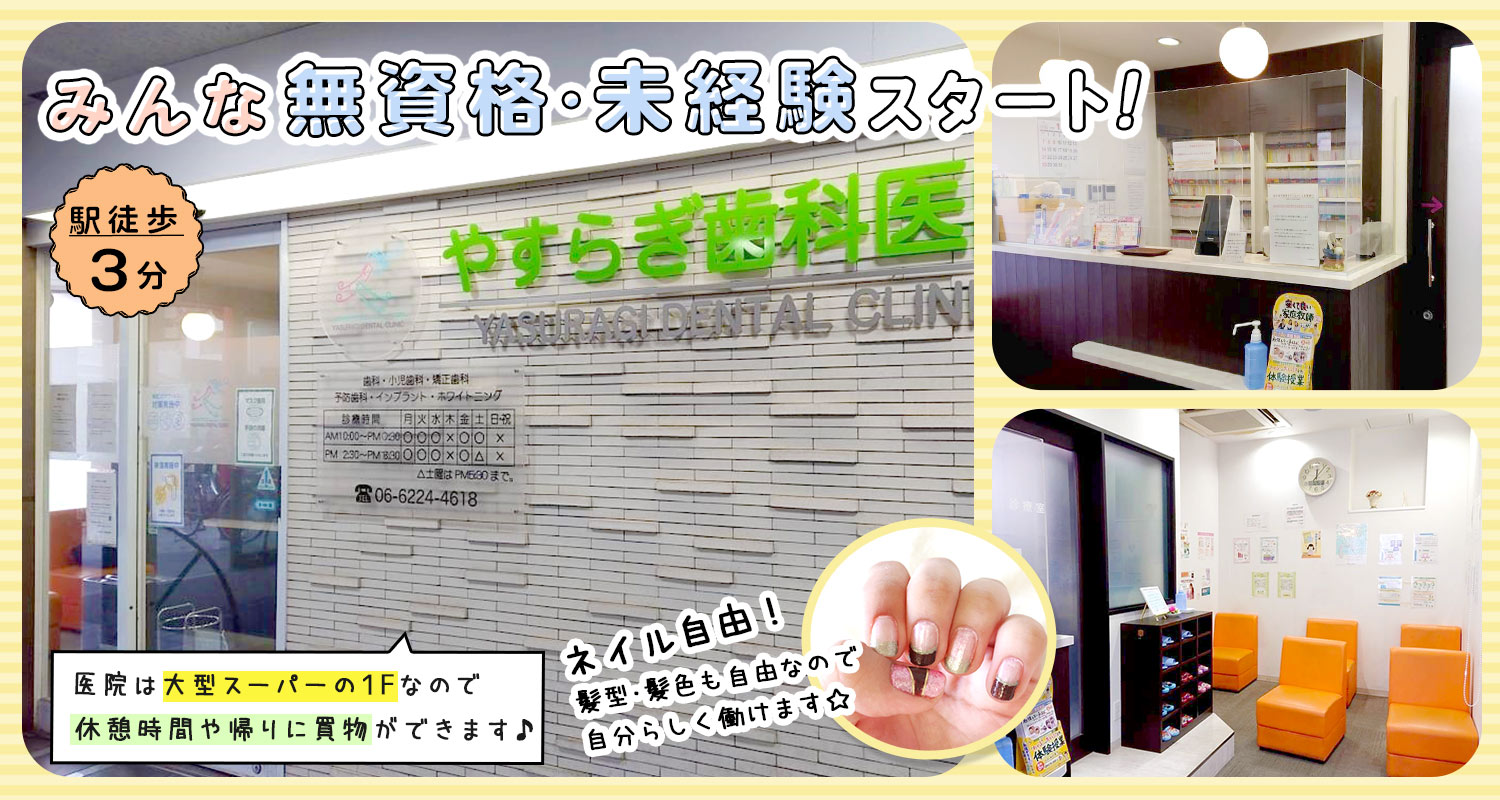 | 仕事内容 | 事務受付・歯科助手[社] 治療のアシスタント(器具の準備や片付け)の他、患者様の受付・電話応対、会計・予約管理などをお願いします。 □□□ ◆無資格でできる医療のお仕事 歯科に関する知識や経験は一切問いません。 器具の名前など一つひとつ丁寧にお教えしますし、最初は診療の準備・片付けなどかんたんな業務から始め、少しずつ慣れていきしょう。 その後、受付などもお任せしていきます。 ◆ブランクのある方も歓迎 子育ても落ち着き、久々の職場復帰を目指す方も大歓迎!30~40代で、歯科医院での勤務が初めての方もOKです◎ もちろん経験者は大歓迎で、即戦力としてお迎えします! |