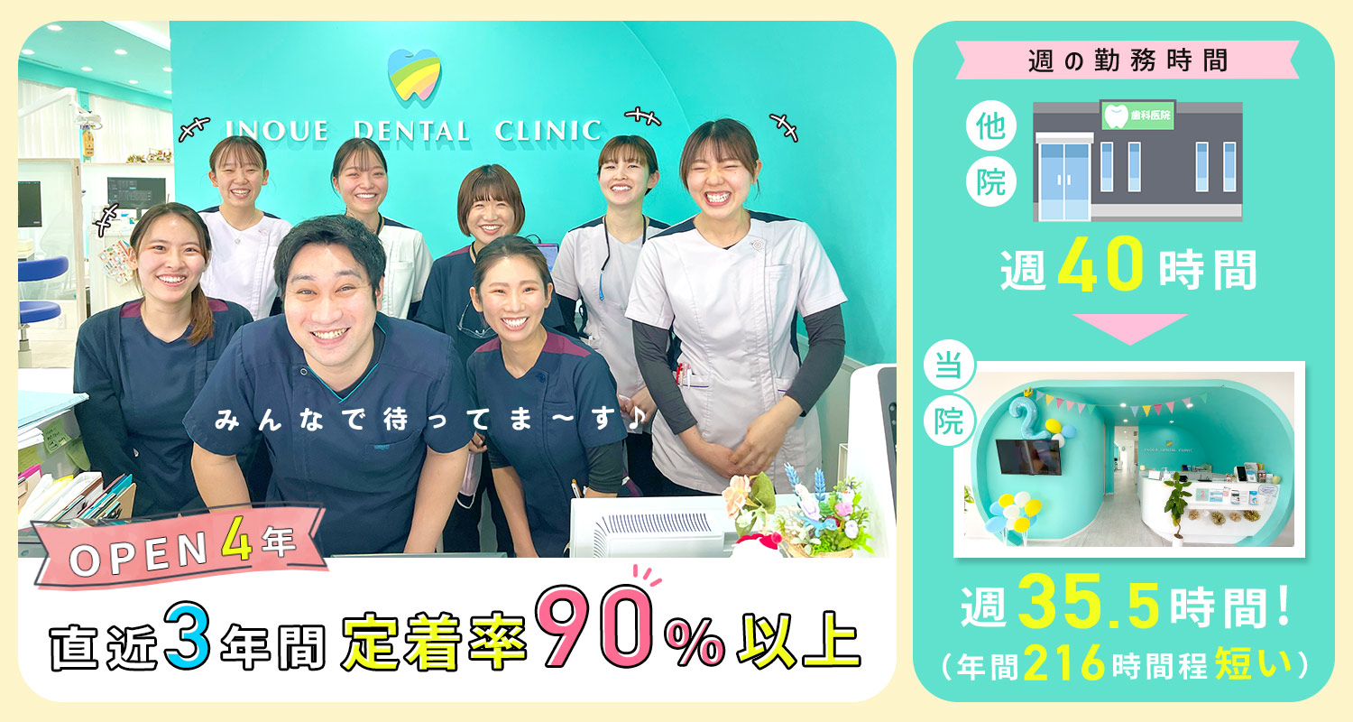 | 待 遇 | #賞与あり 年2回 #昇給あり 年1回 住宅手当 (月1万円)※交通費の掛からない方 引越し費用補助(医院が一部負担) 社会保険完備 交通費規定支給 車通通勤要相談 バイク・自転車通勤OK 残業手当 (1分単位で支給) 研修制度 社割制度 退職金制度 スタッフルーム完備 髪型・髪色・ネイル自由(清潔感があり、派手すぎなければOK) 研修費用全額医院負担 ※外部講師による歯周病治療の研修会を開いたり、小児矯正の講習会(40万円相当)への参加実績あり |