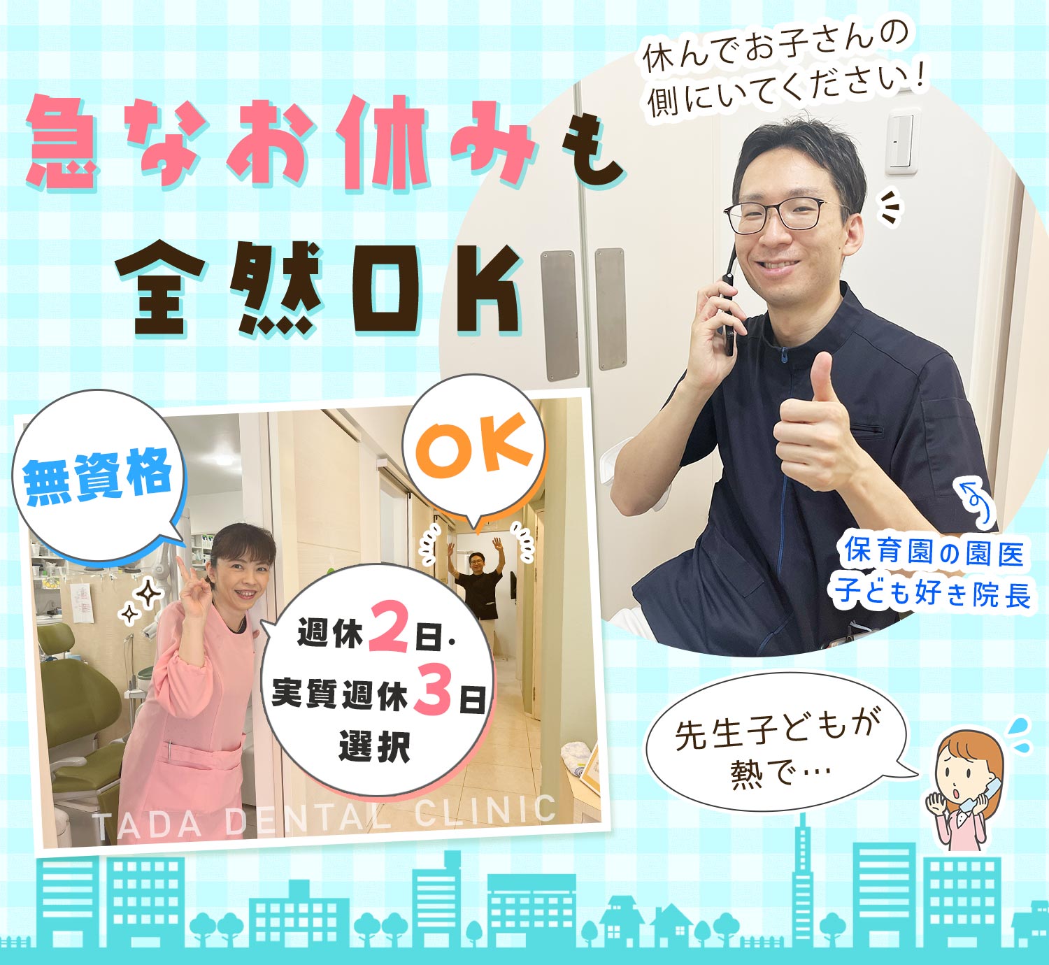 | 仕事内容 | 事務・受付・歯科助手[社] 受付業務と治療のアシスタント業務をお任せします。 具体的には… ◆受付事務 お会計や予約やカルテ管理など、受付経験の無い方でもスグに業務を覚えていただけますよ◎ ◆アシスタント(助手業務) 治療で使う器具の準備、片付け、診療補助をお任せします。 器具の名称などを覚えるのに、半年程かかりますが、一度覚えてしまえば一生、活かせるスキルになります! |