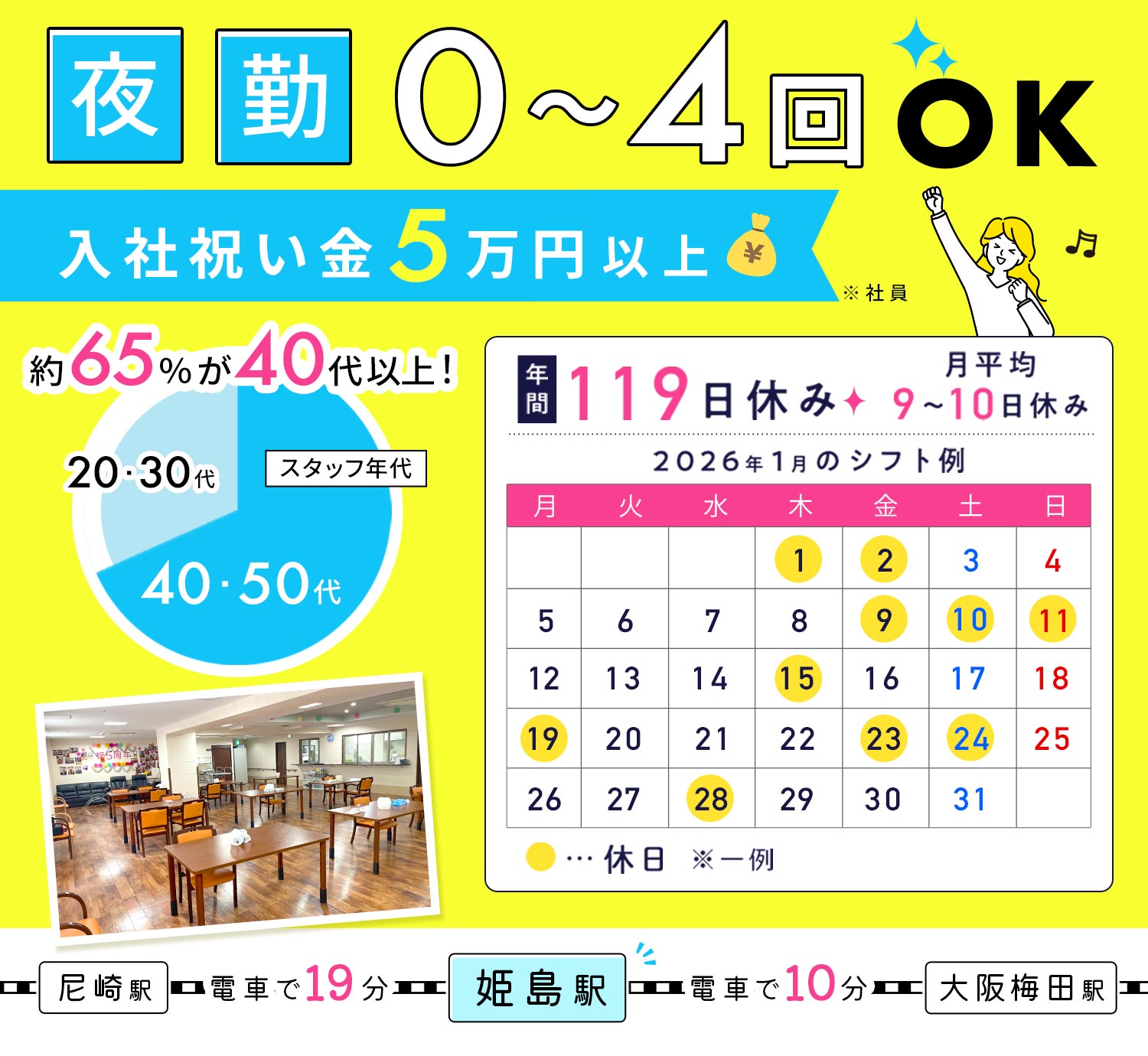 <定年なし>休みは年119日以上☆夜勤0~4回希望OK