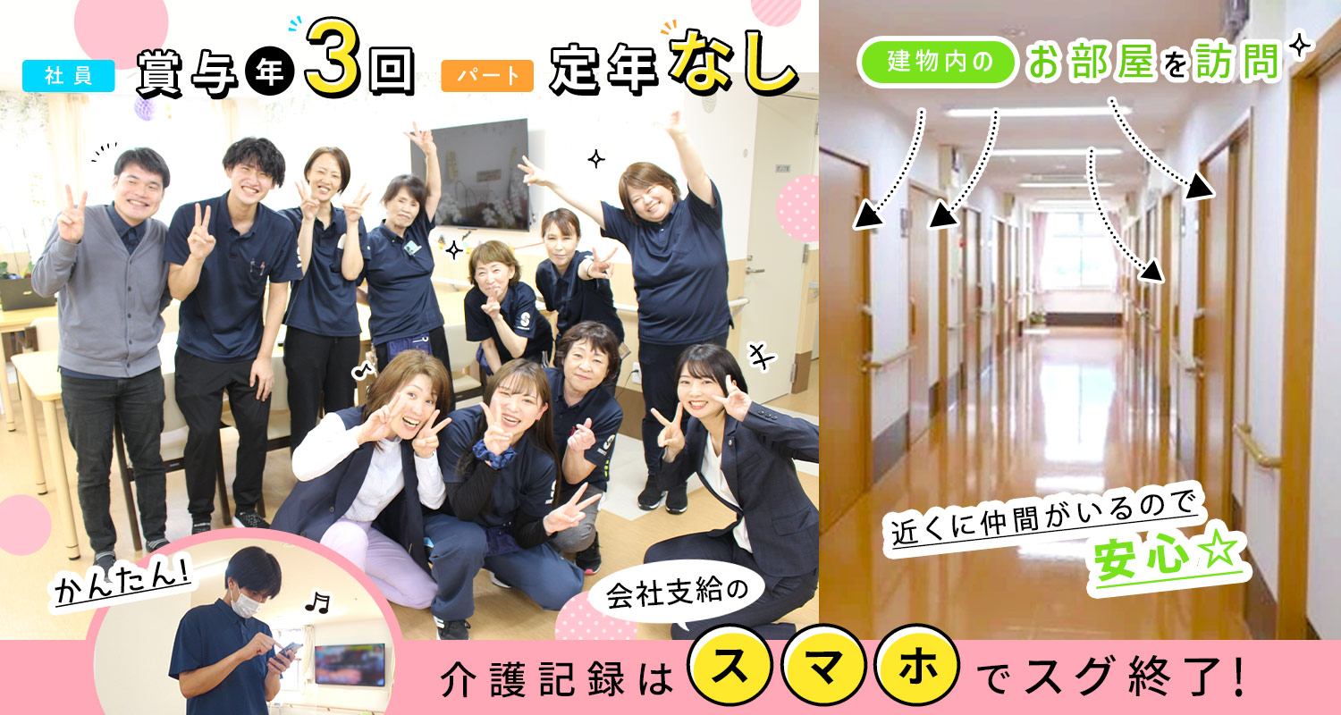 | 仕事内容 | (1)介護職/パート[パ] (2)介護福祉士/パート[パ] 入居戸数37戸の住宅型有料老人ホームでの介護業務全般。 入居者様の生活のサポート(食事・口腔ケア・入浴・排泄介助・生活援助)などをお願いします。 ◆ケアの伝票は会社支給のスマホを使用 紙への記録と比べて事務作業の負担を大きく軽減! (紙の記録は平均30分~1時間程→スマホなら10分程に☆) 使い方は丁寧にレクチャーしますし、50代以上の方も便利に使いこなしています◎ ◆タイムスケジュールが毎日組まれているので、 時間に追われながらの入浴介助…なんてこともなく、ゆっくりと入居者様に向き合えます! |