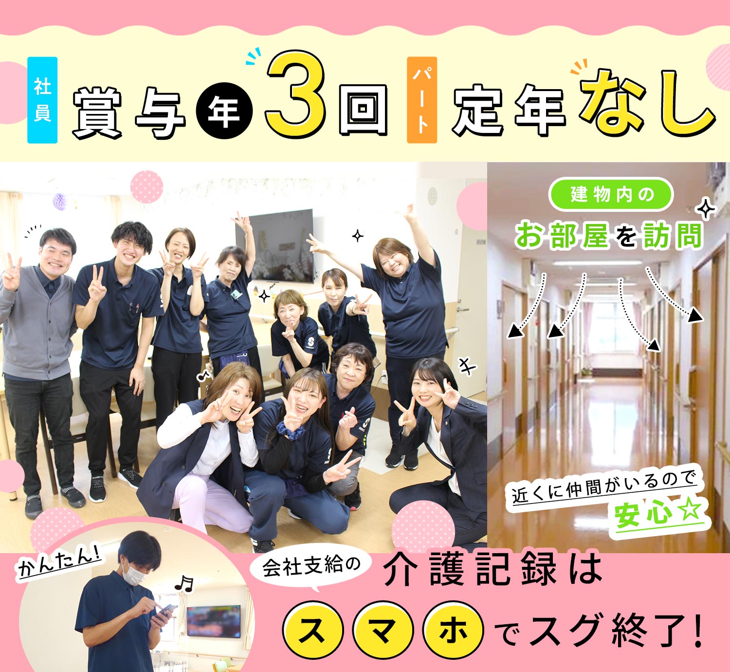 | 応募方法 | ◇ お気軽に【応募する】ボタンよりご応募ください ◇ 24時間受付中です 私服面接OK! まずは見学も歓迎!※希望者のみ 施設の雰囲気や一緒に働く仲間を見てからの応募でも大丈夫です。 □□□ 電話での応募も受付中! 「ジ ョ ブ ポ ス タ ー を見て応募したのですが」と、 お電話すると、スムーズです! |