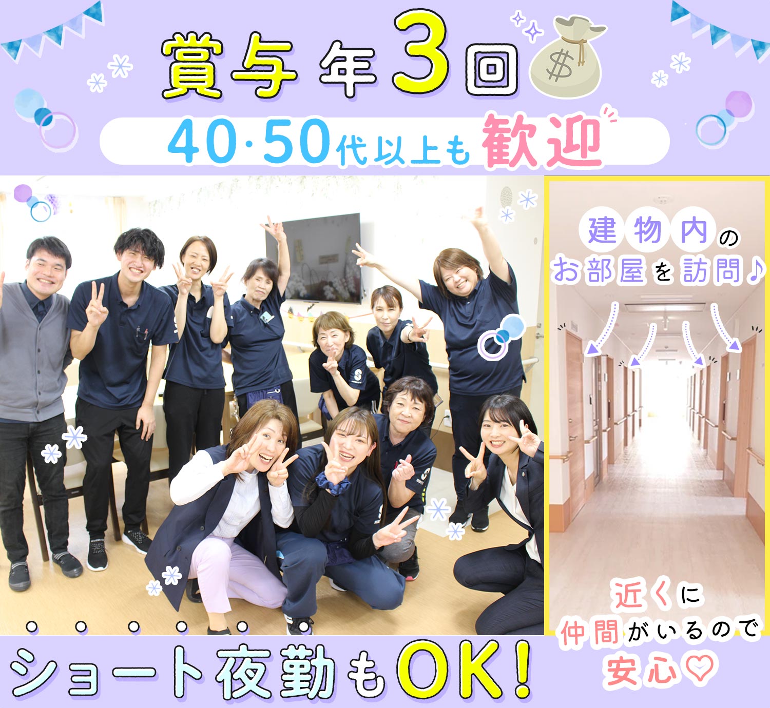 仕事内容 (1)介護職・ショート夜勤/賞与年3回[社]