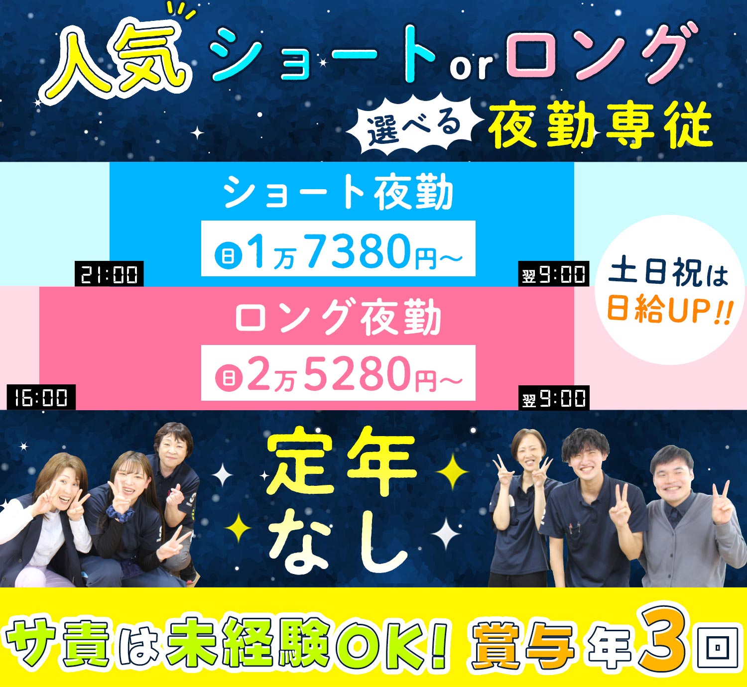 | 職 種 | (1)夜勤専従介護職(ショート夜勤) (2)夜勤専従介護職 |