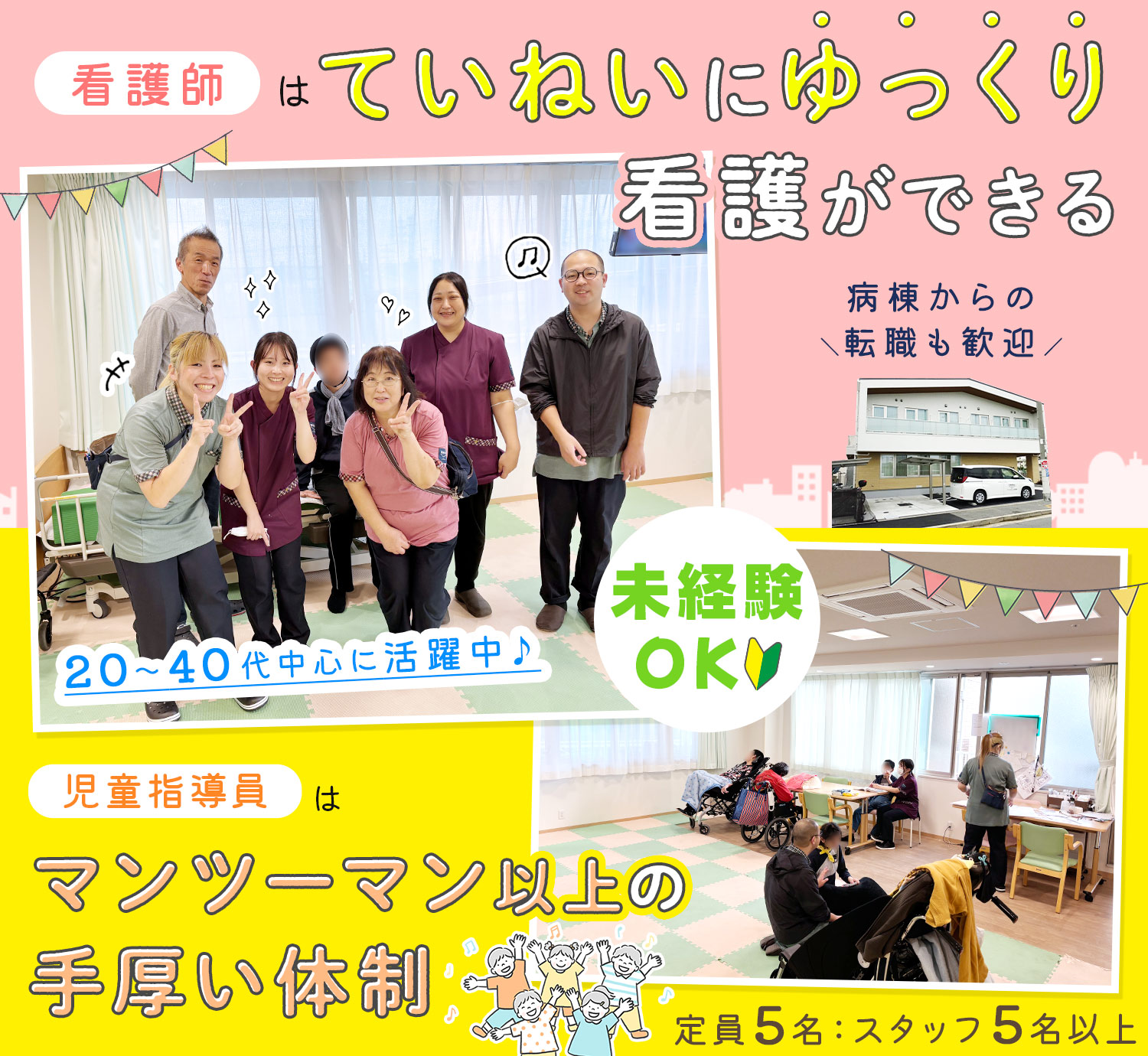 | 仕事内容 | 看護師/パート[パ] 障がいをお持ちの方が日中の生活を過ごされる施設での勤務。 利用者様の健康管理、服薬管理、医師の指示に基づく処置(注入・吸引など)の他、支援員のサポートもお願いします。 その他、送迎の添乗、創作活動、レクリエーション、リハビリ、外出などのサポートなど 利用者数:1日平均12~15名(定員15名) スタッフ:支援員8~9名+看護師2名 ◆看護師のあなたはとっても頼りになる存在 医療ケアが必要な利用者様にとって、利用者様やご家族の方からはもちろん、支援員からもとても頼りになる存在。 あなたがいるから、利用者様は安心して過ごすことができます。 看護師としてやりがいをもってお仕事できますよ。 |