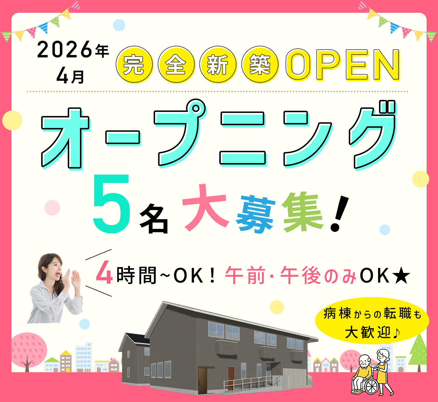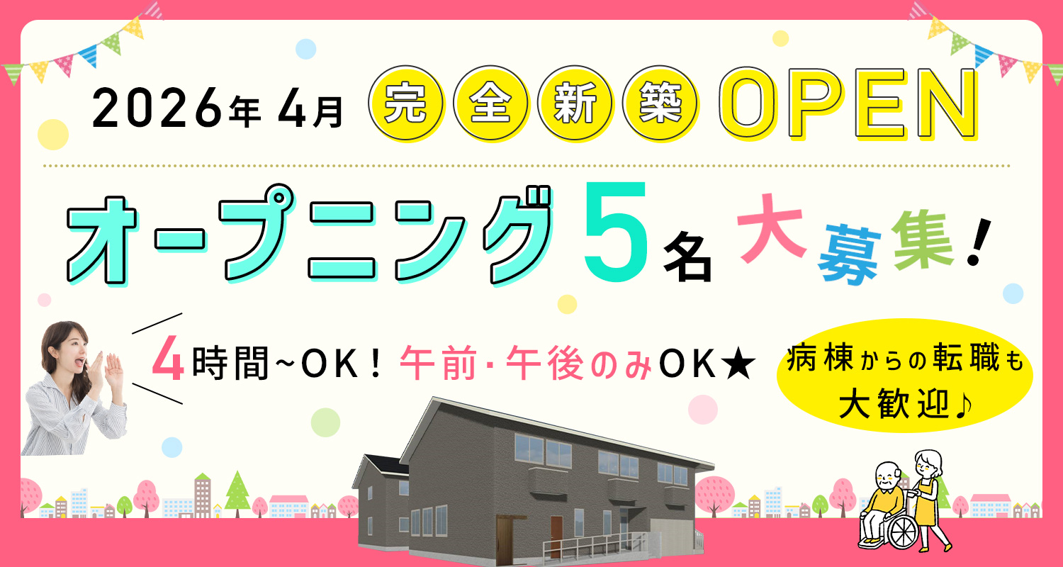 | 仕事内容 | 週1日OKの看護師/オープニング[パ] 2026年4月完全新築OPEN! 定員33名住宅型有料老人ホームにて、 医師やケアマネとの連携を図りながら、医師の指示に基づく処置、病状観察、リハビリケアなどをお願いします。 #オープニングスタッフ |